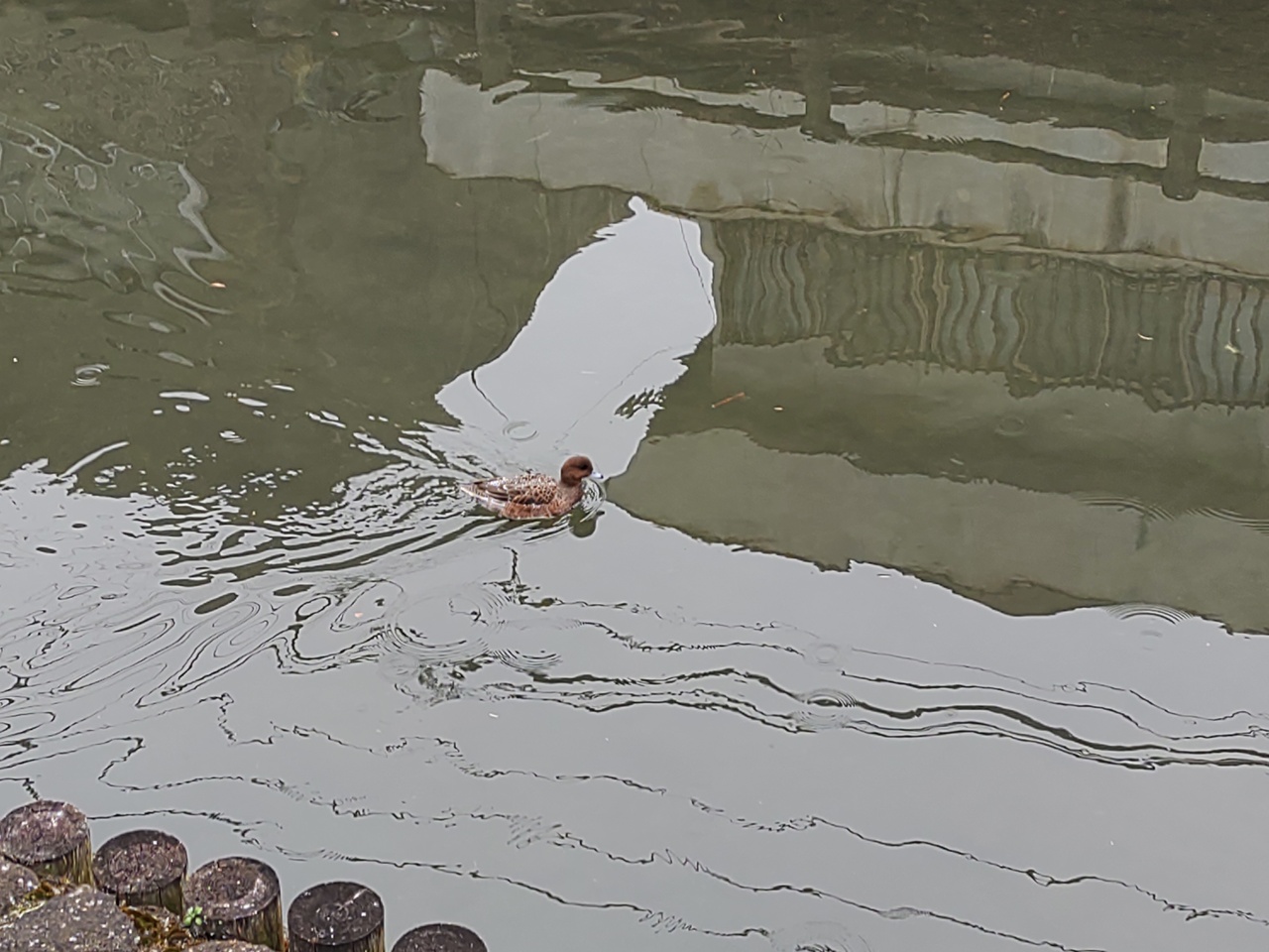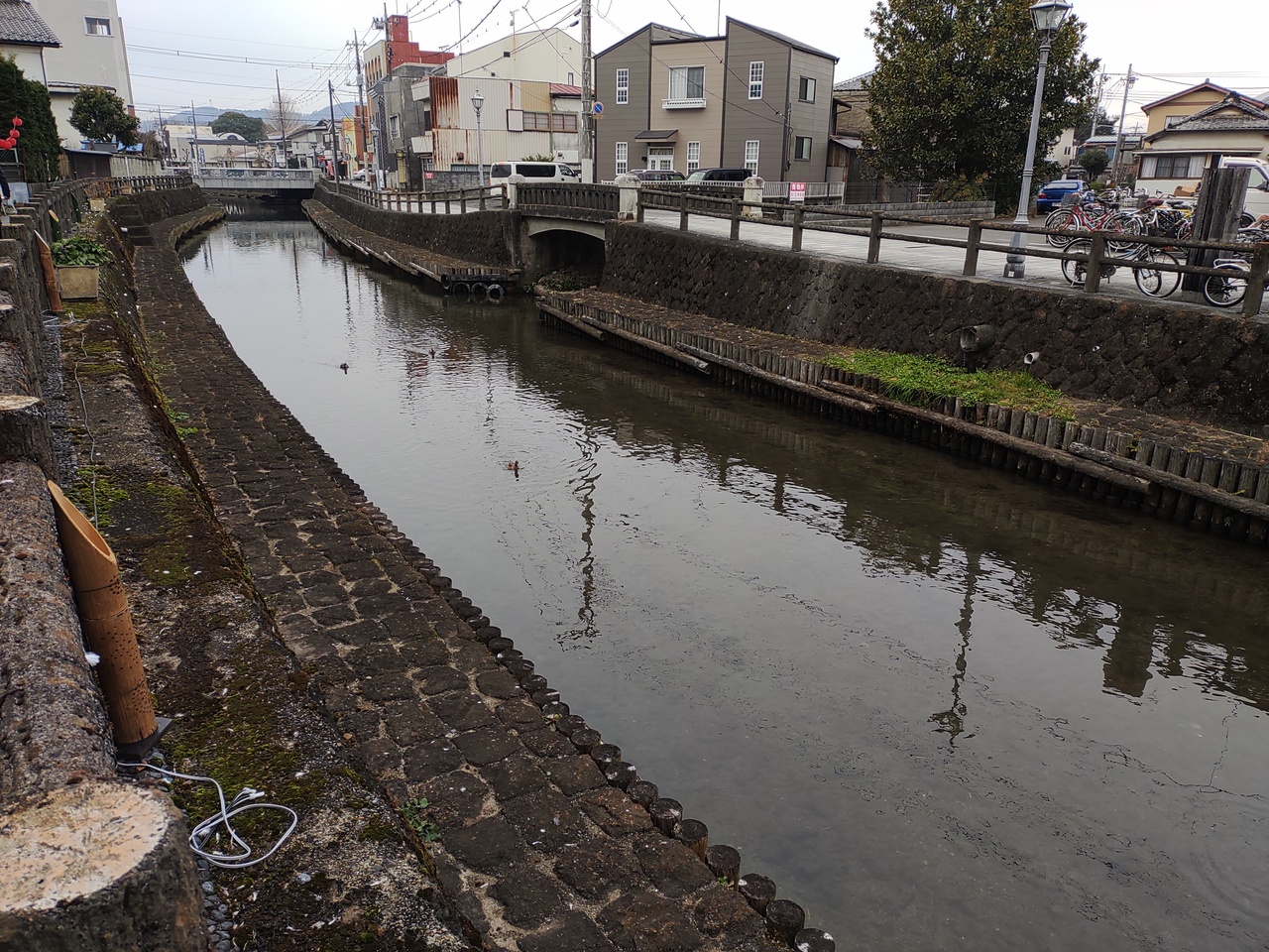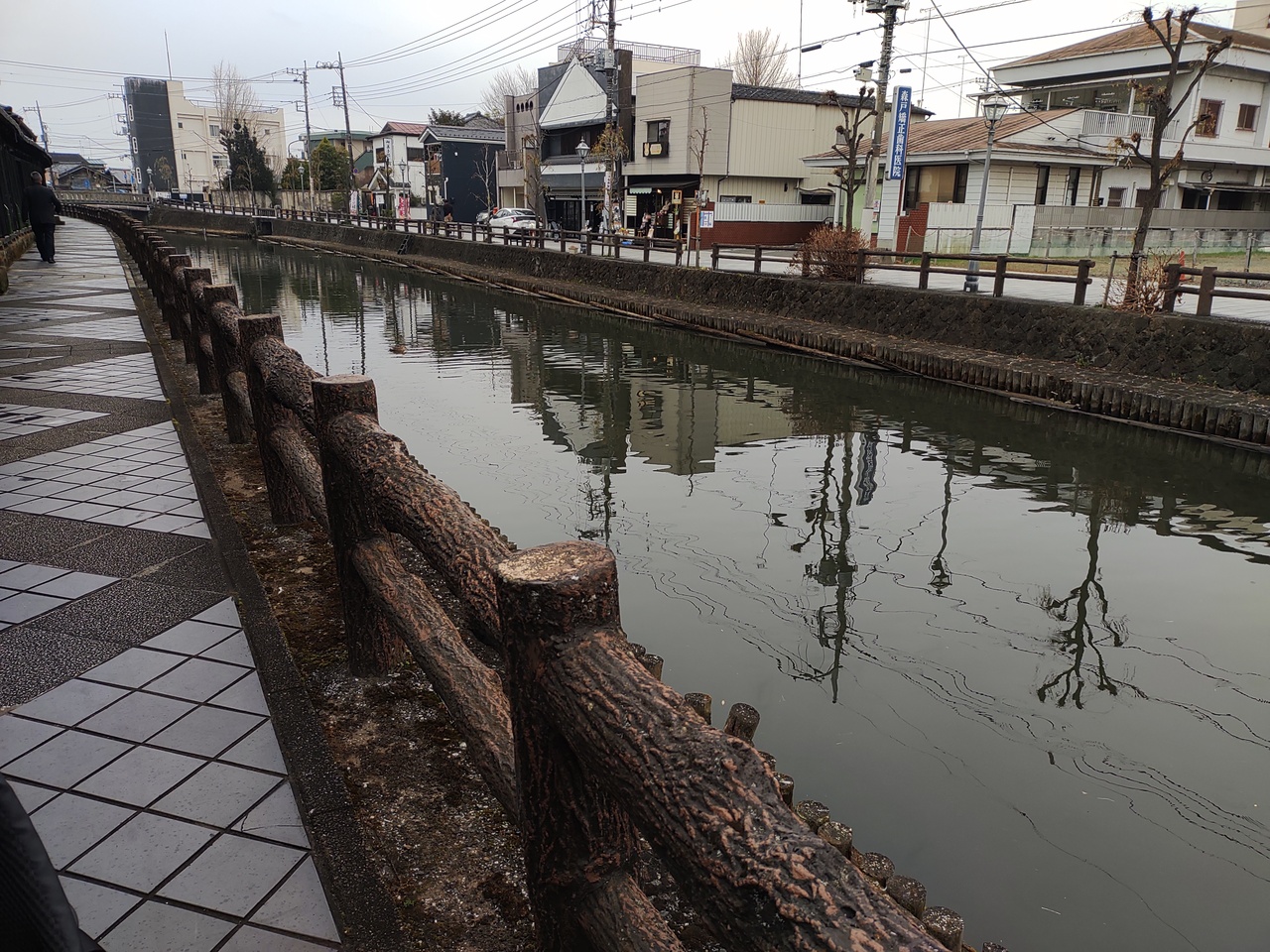 茶色い水鳥達が、寒い中、泳いでいました。子供達がエサをあげると、数十羽の水鳥達が集まって来ました。圧巻でした。水面に、街並みを映していて、とてもきれいでした。水が澄んでいました。蔵の街の黒塀とマッチして、美しかったです。