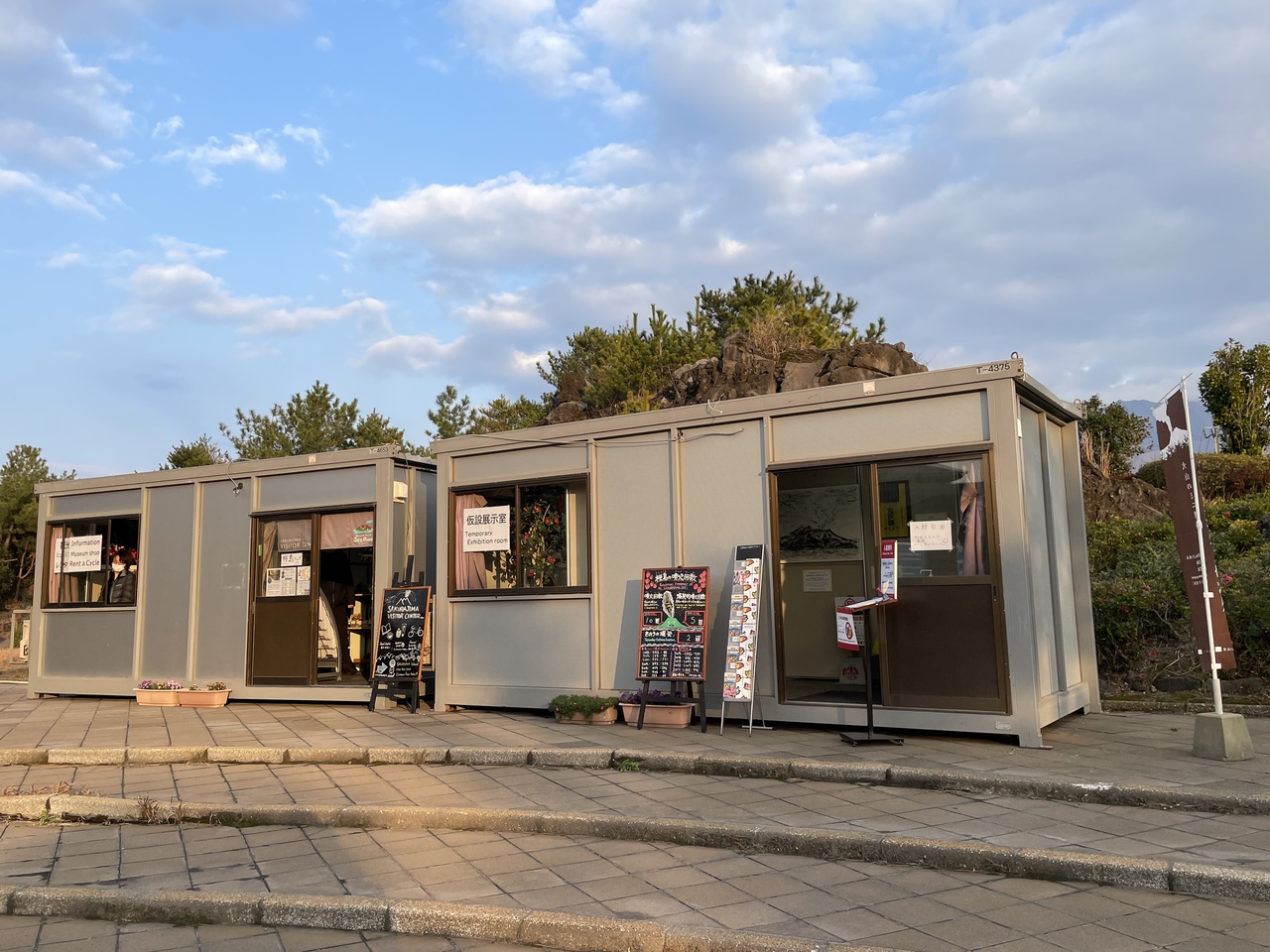 桜島港からも近いビジターセンターです。1月中旬、館内は工事中で立ち入りできず、仮設プレハブでちょっとした展示と売店が営業していました。スタッフがおり、「噴火」と「爆発」の違いなど、案内していただきました。