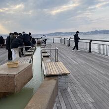 桜島港からも近い桜島溶岩なぎさ公園内にある足湯です。屋根もないオープンな足湯ですが、これが長く、たくさんの人が一度に入ることができます。桜島をバックに錦江湾を眺めながらの足湯です。この日は修学旅行生で賑わっていました。