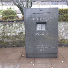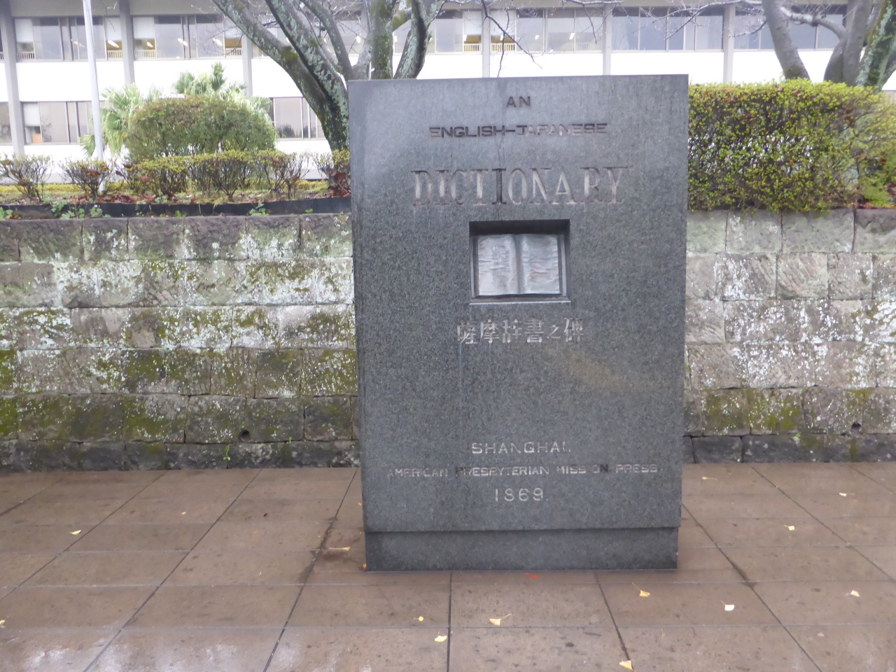 鹿児島県立図書館の入り口に「薩摩辞書の碑」の石碑があります。薩摩藩学生高橋新吉と前田正穀が共編した「和訳英辞書」の通称が「薩摩辞書」。上海で翻刻し明治2年に出版された業績を称えた碑だそうです。石碑だけ見てもよくわかりませんでしたが、あとで調べてみてわかりました。