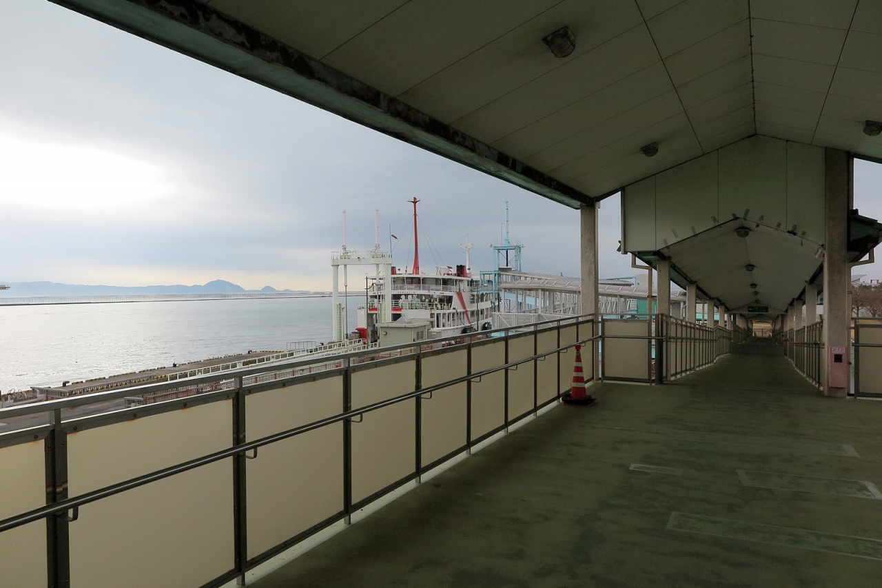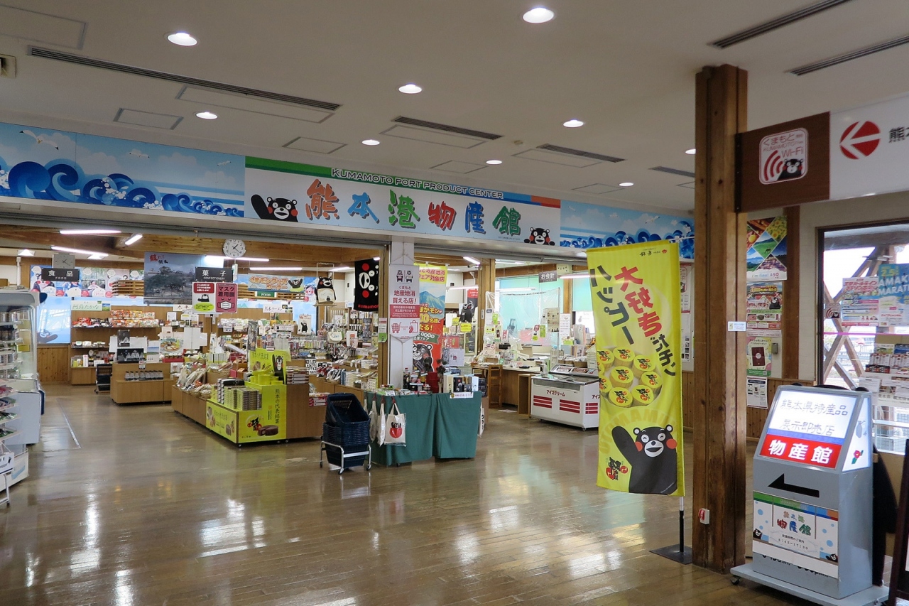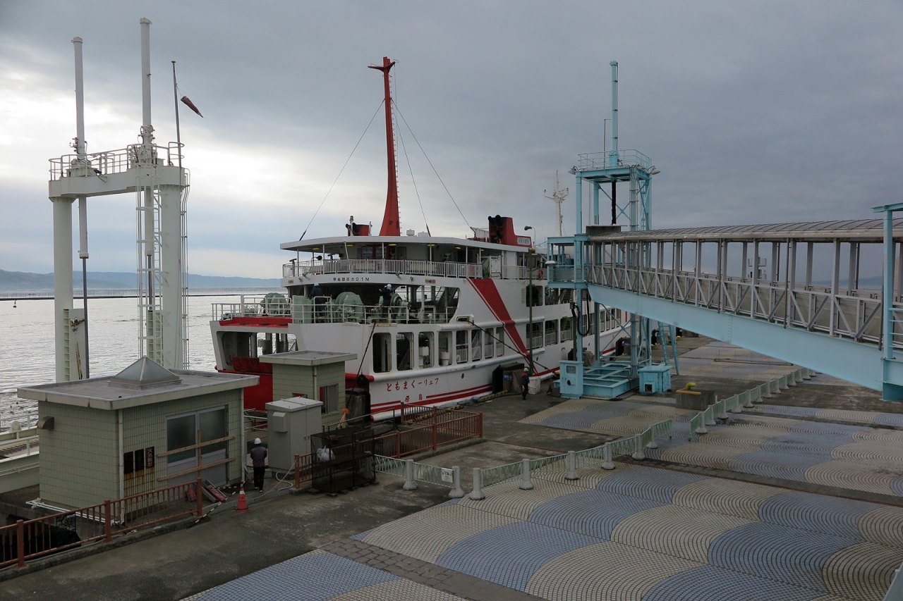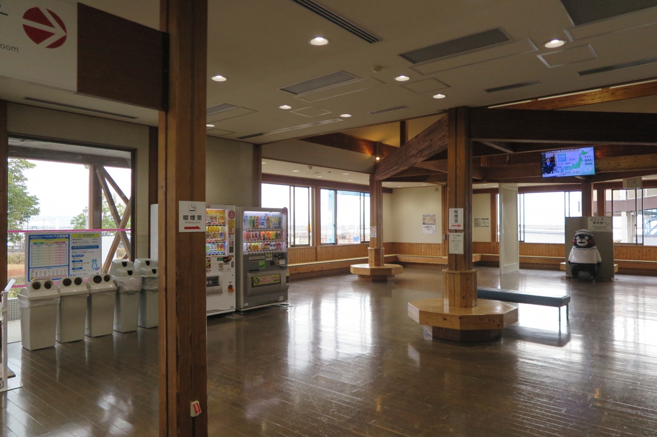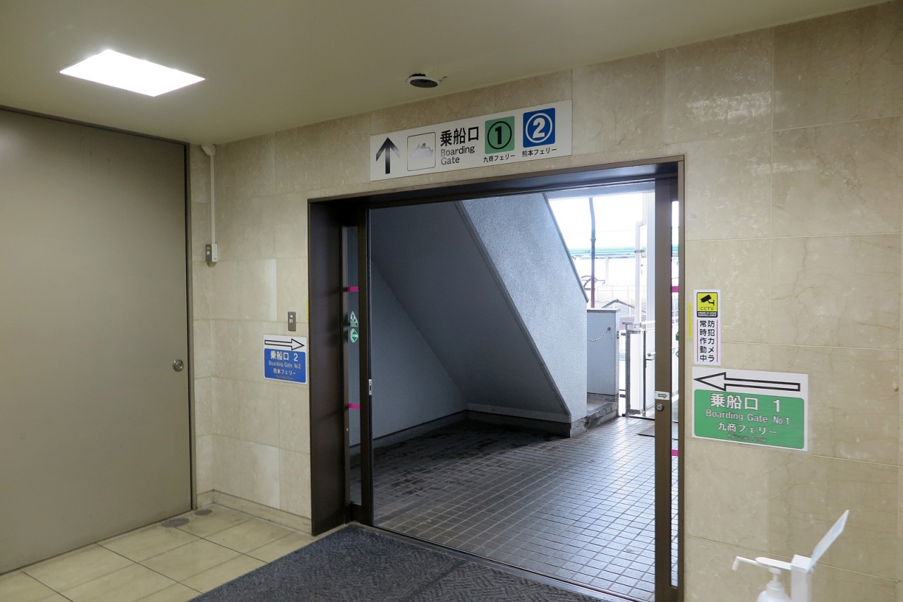 九商フェリーの無料シャトルバスで熊本駅から20分、熊本港フェリーターミナルに到着です。乗船するフェリーの出発時間まで、少しターミナル内を探索しました。館内はなかなかに綺麗、カフェ1か所、熊本の土産物屋さんもありましたので最後の買い物もできます。乗船までの時間を過ごす場所も十分でした。乗船口から船へと向かうブリッジの長さや風景のゆったり感は、他の乗り物にはないものですね。