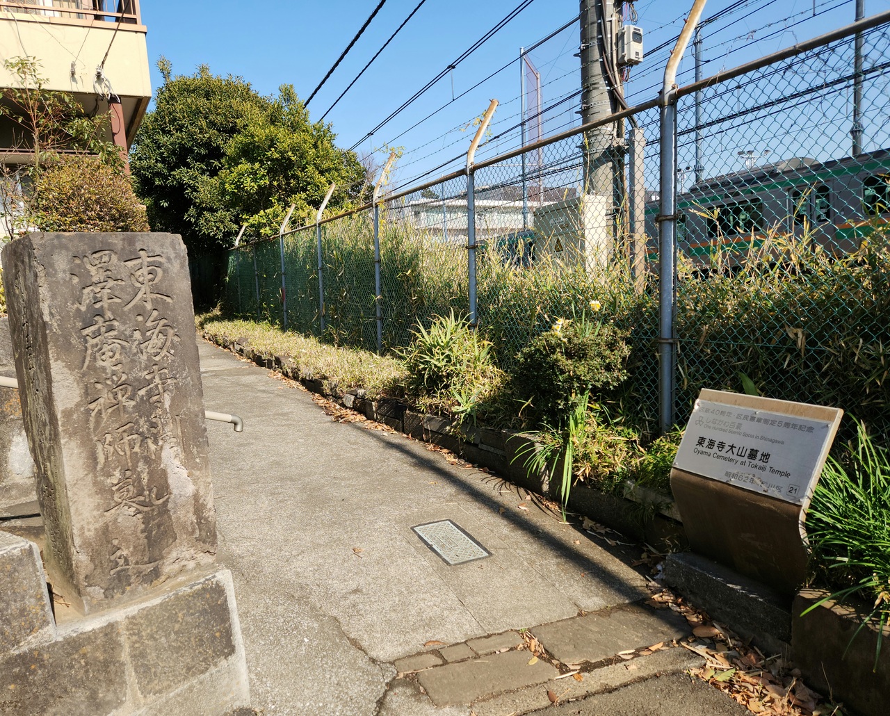 線路と線路に挟まれた三角州のような敷地が墓地になっていますが東海寺自体はもっと駅寄りにあります。