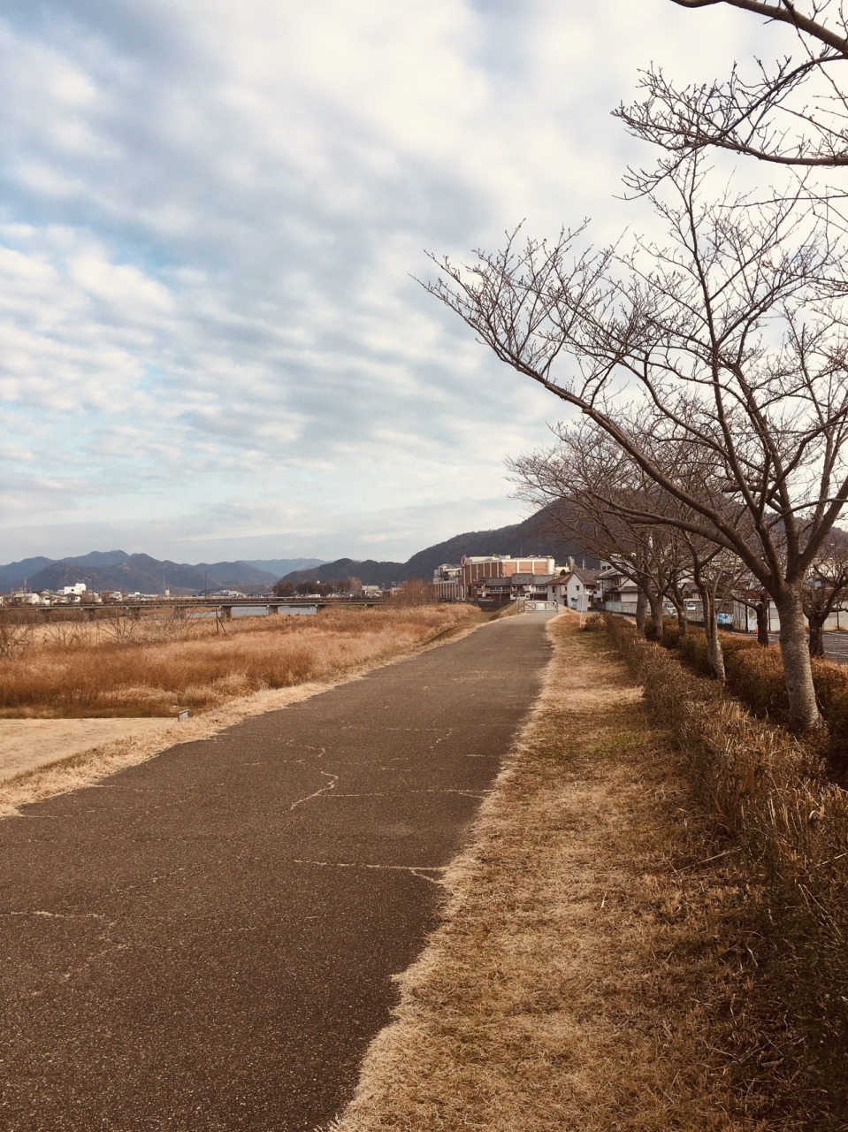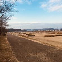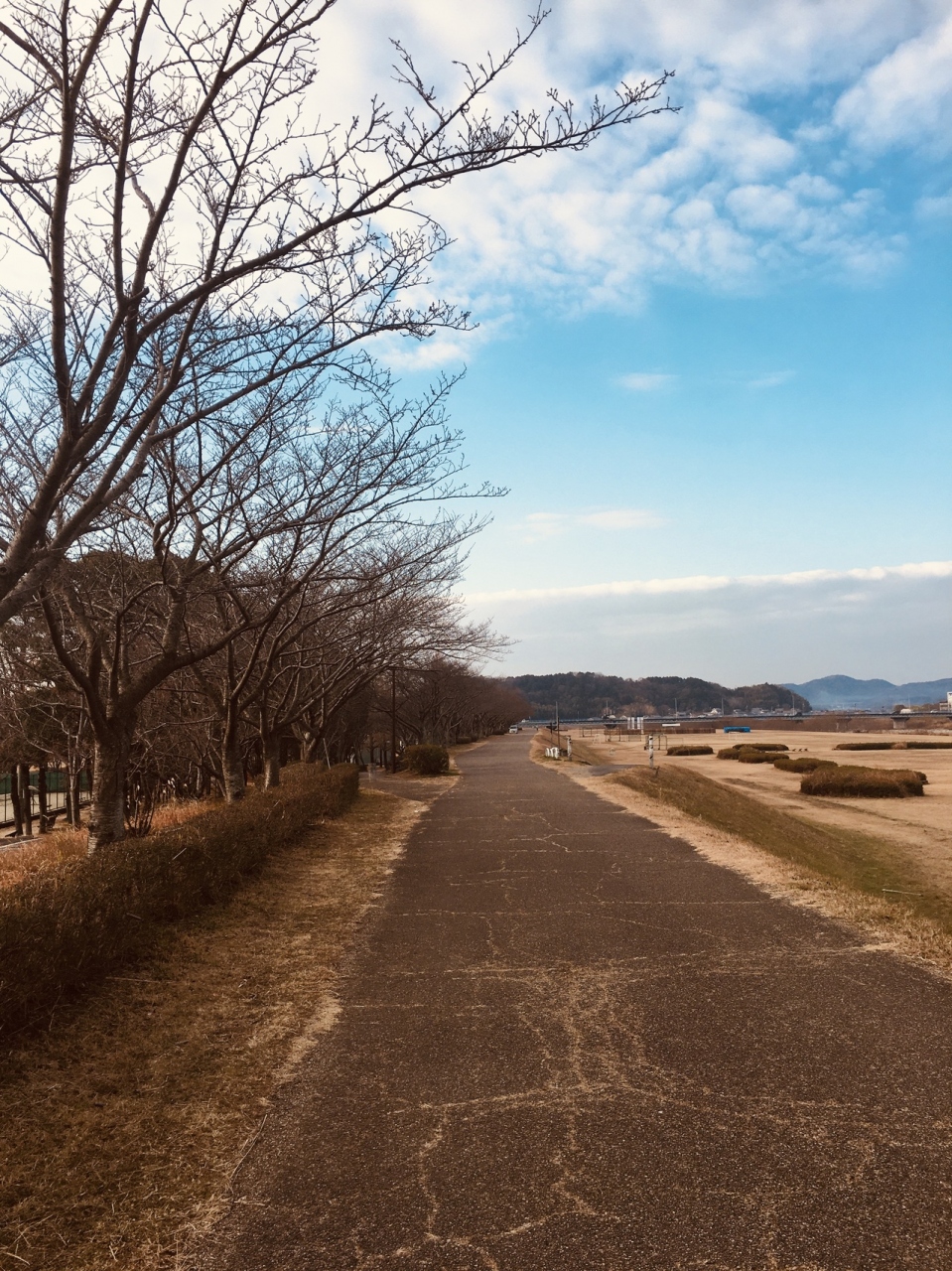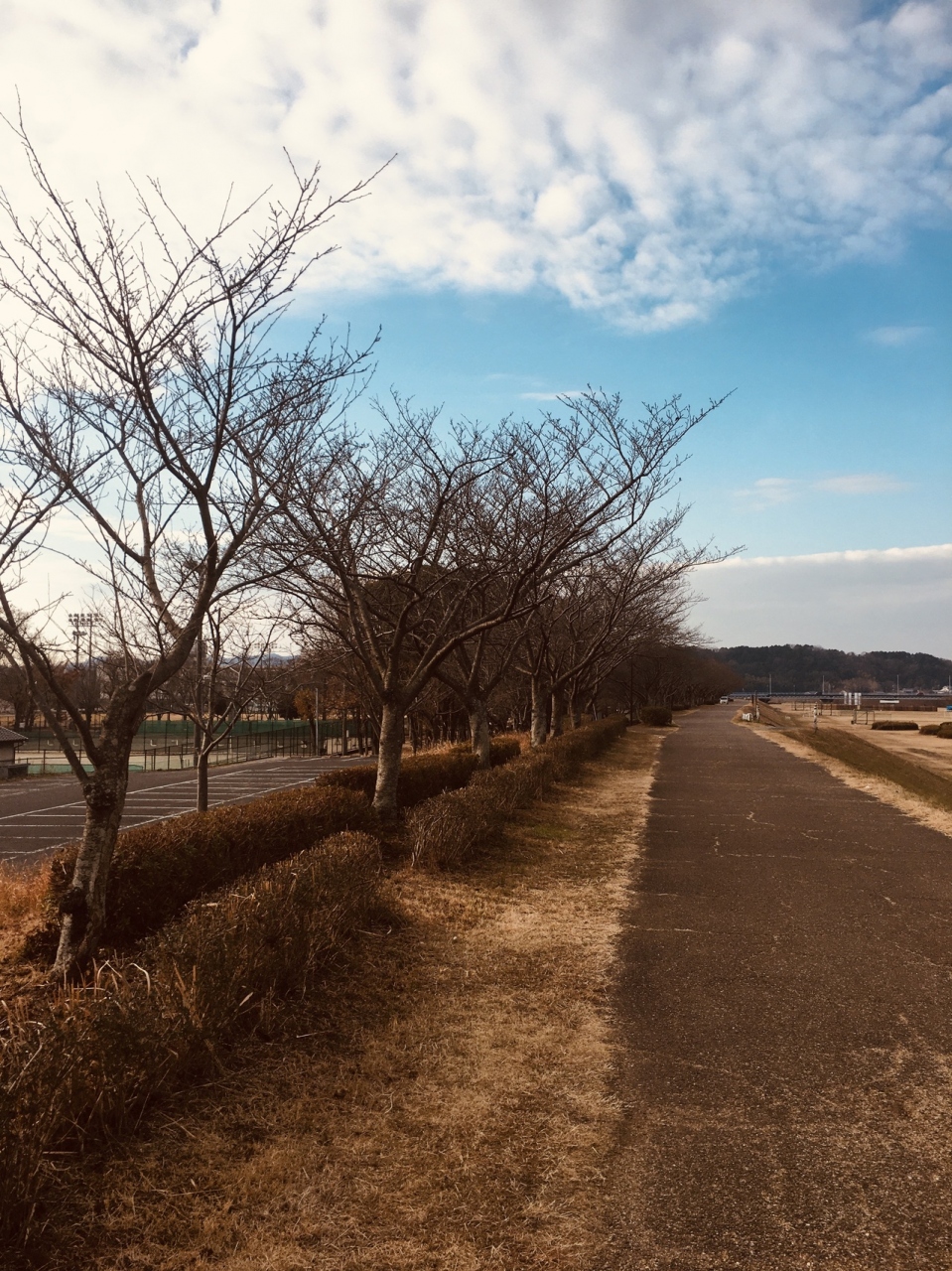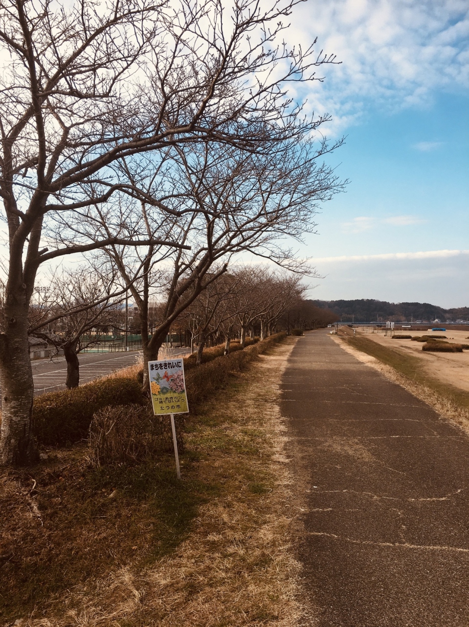 揖保川で、JR本竜野駅からと龍野の街並みの中間ぐらいにあるので街並み見学前に立ち寄り。整備された歩道があり土手の上を歩きました。縦長の公園で河川敷公園です。広場、ゲートボール場等もあり、土手沿いにはさくらの木が連なっていました。