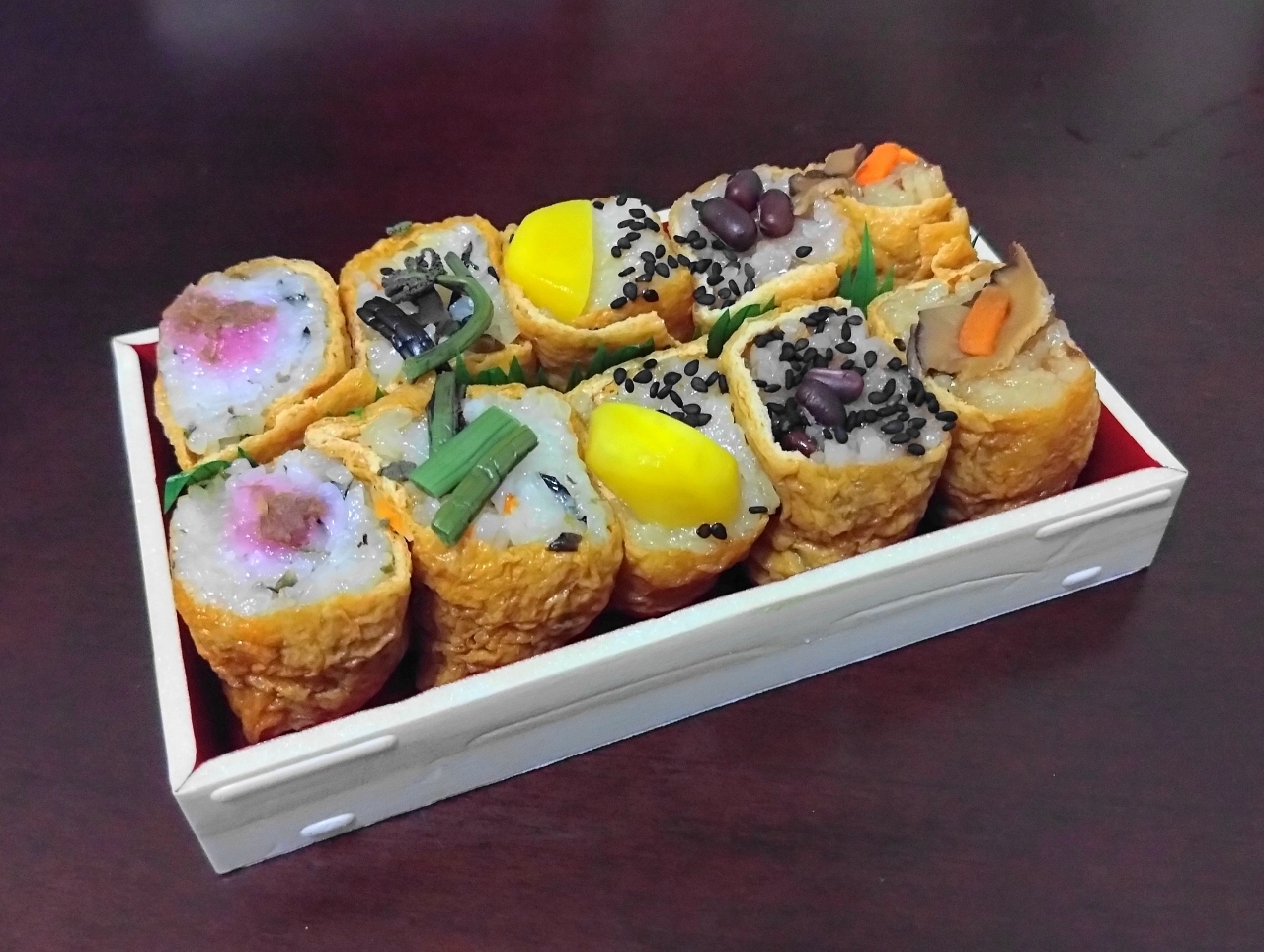 梅・山菜・栗・あずき・五目おこわ、一口サイズのおこわいなりが並びます。