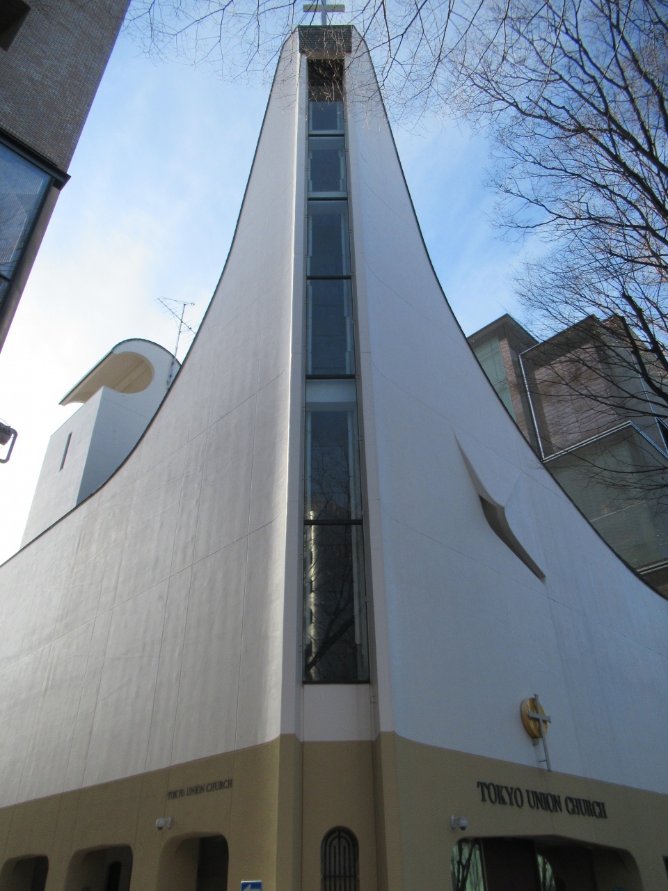表参道ヒルズの向かいに建つ白い建物です。1872年に築地に会堂が造られて、のちに現在地に移りました。国籍、人種、宗派を超えたクリスチャンが集まり英語で礼拝を行っています。創立から150年が経った教会です。高級専門店が入っている周囲のビルと異なり、入り口部分はガラス扉ですが、十字架から広がる外壁が特徴的です。すっきりした建物です。後で調べて、江戸時代末期から日本に居住する外国人のために造られた経緯について知りました。長い歴史を持つ教会です。