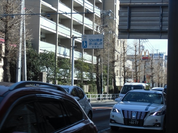 碑の目の甲州街道には、行先案内標識のような「50㎞競歩折り返し点」の標識があります。