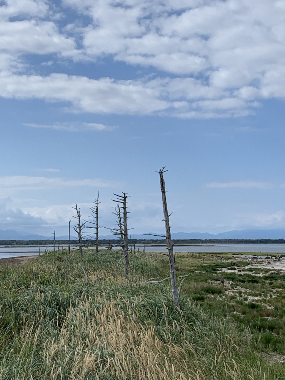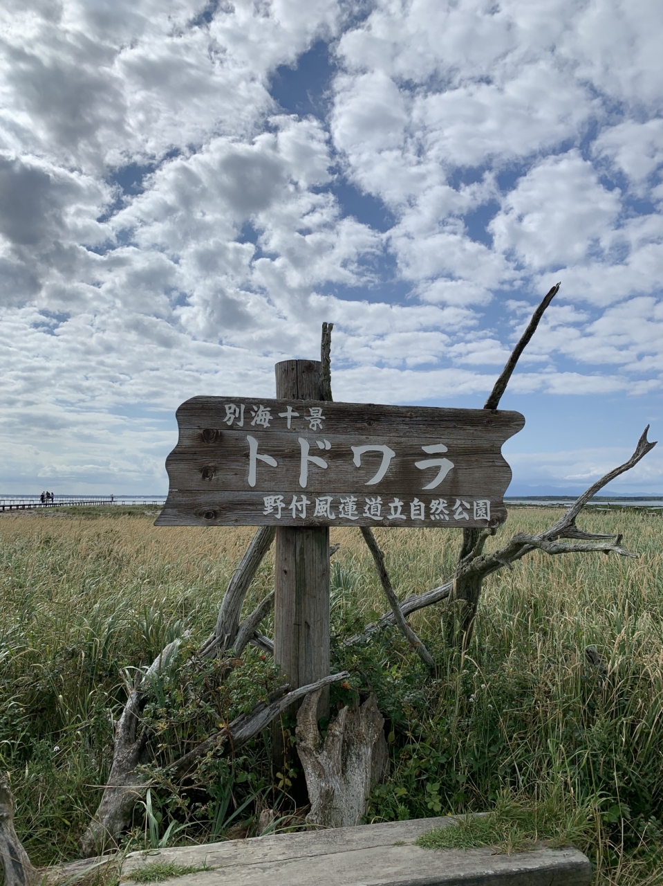 野付半島ネイチャーセンターからかなり歩くかトラクターバスに乗って先端付近まで行ったら見ることが出来ます。年々少なくなっているそうでわずかに残っていました。トドワラは、地盤沈降などによる海水の浸食と潮風で、トドマツ林が立ち枯れたものだそうです。風化が進んでいて近いうちにはトドワラ跡になるらしいです。