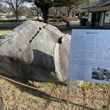 名古屋城の正門のそばの有料エリアを出て道を渡り、少し歩いたところに加藤清正の像がありますが、この像のそばにある石です。石垣を造るために石が割られるための穴があけられている石で、昔の石の加工の難しさや工夫が感じられました。