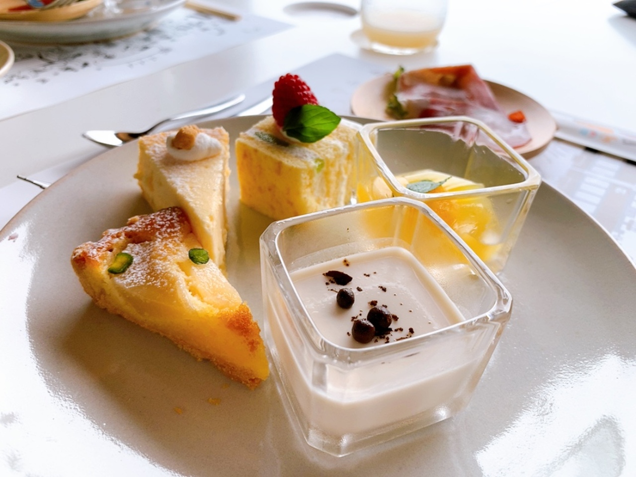 デザートプレートと、オーダービュッフェでケーキを好きなものを好きなだけ頼む事が出来ます。 お口直しにちょうど良い生ハムなどのオードブルなどもオーダー式で注文出来ました。