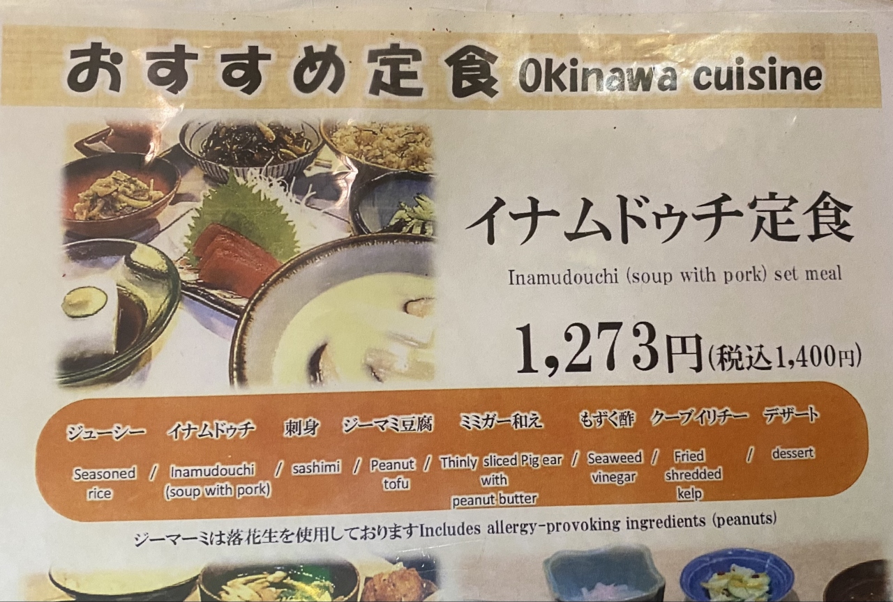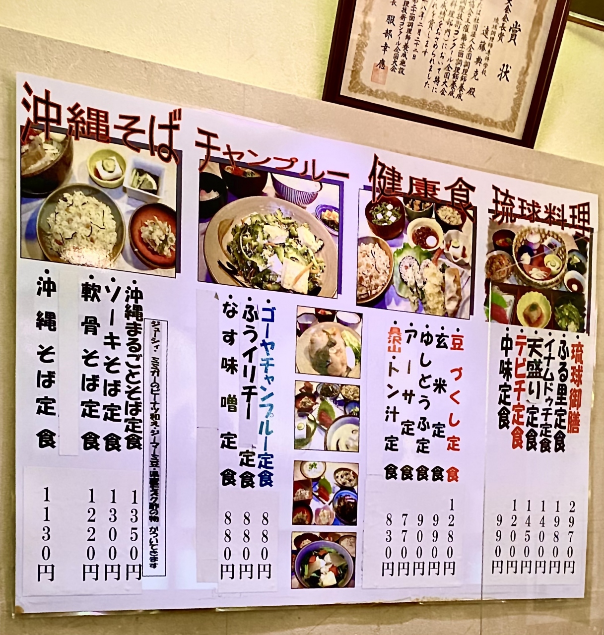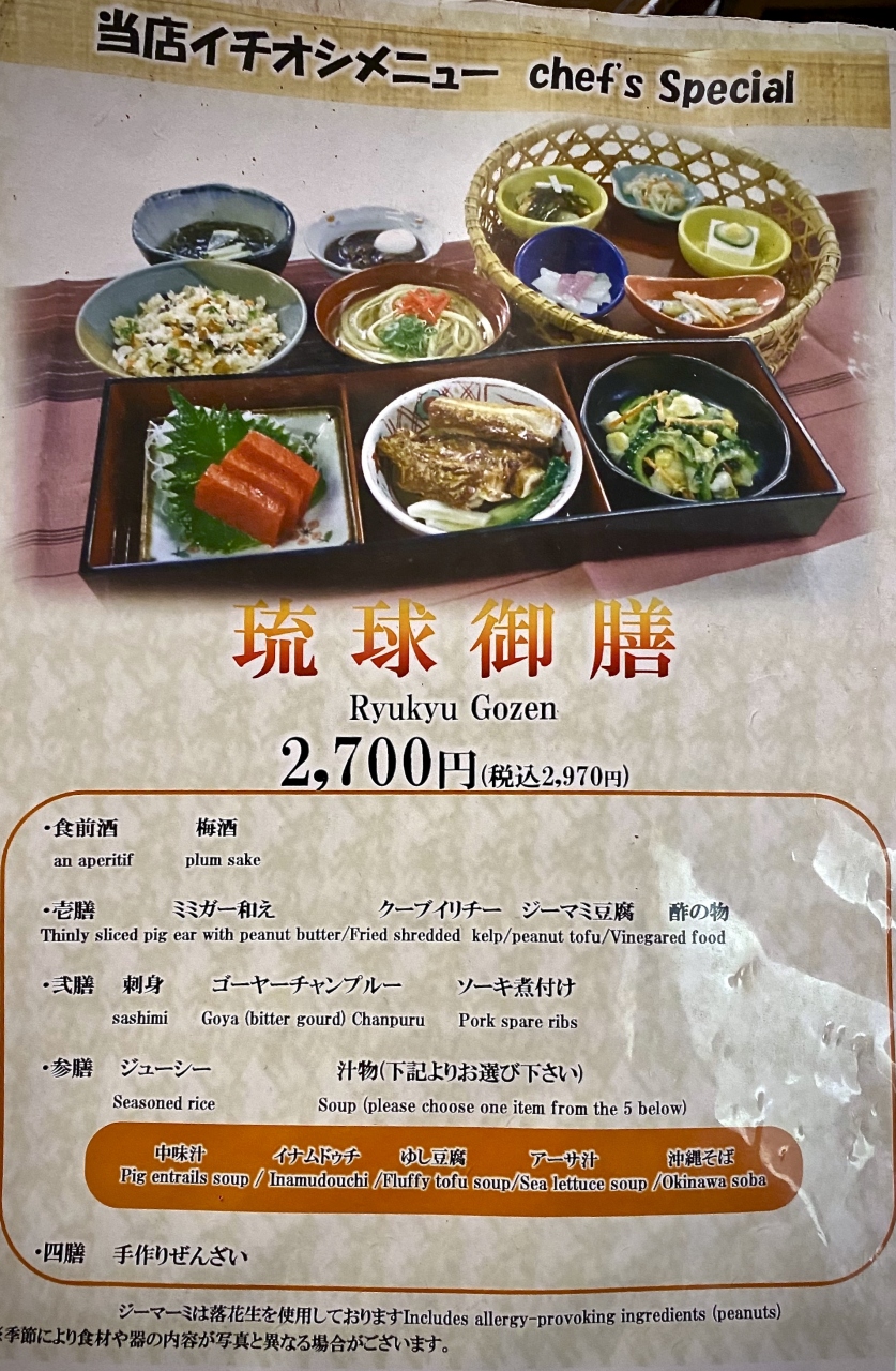 「琉球御膳」「ふるさと御膳」「イナムドゥチ定食」「デビチ定食」「中味定食」「豆づくし定食」「玄米定食」「ゆし豆腐定食「アーサ定食」「ゴーヤチャンプルー定食」「ふうイリチー定食」「沖縄まるごとそば定食」他 名前を聞いただけでもゾクゾクします。