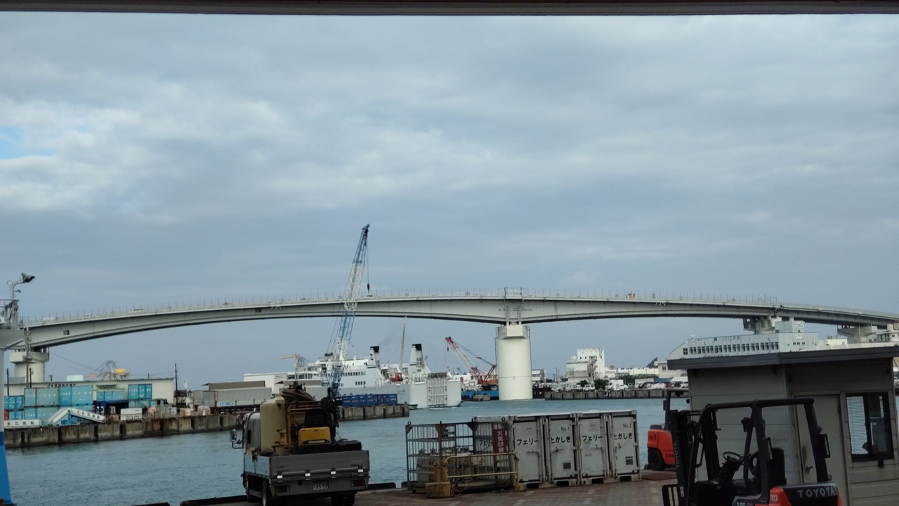 那覇市の港架かっている橋です。泊のフェリーターミナルを出港や入港する大きなフェリー等が下をくぐります、したがって橋もそれなりに高さがあります、離れていてもはっきりわかる白い大きなアーチ橋で泊地区のランドマーク