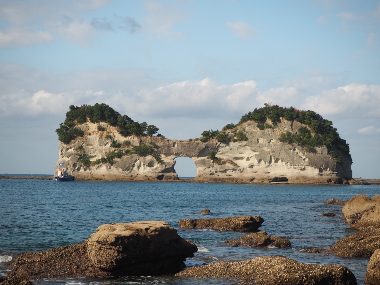 観光船で近くまで行けるようですが、展望駐車場に車を駐めて見学しました。
