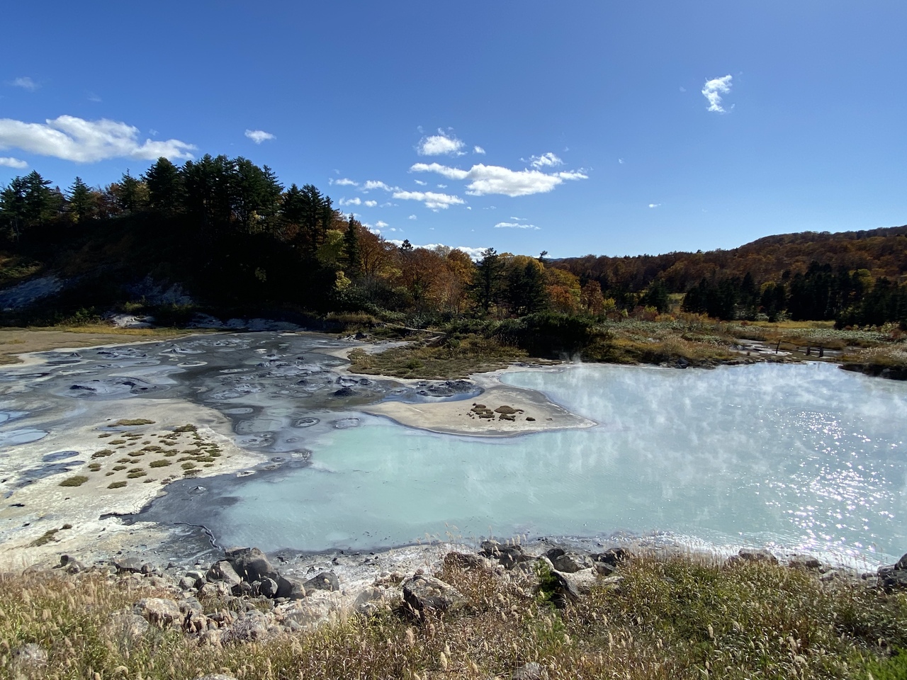 すごい蒸気が立ち上がる散策路を一番奥まで歩いて行くと、真っ青な沼があって、とても神秘的で綺麗な景色でした。