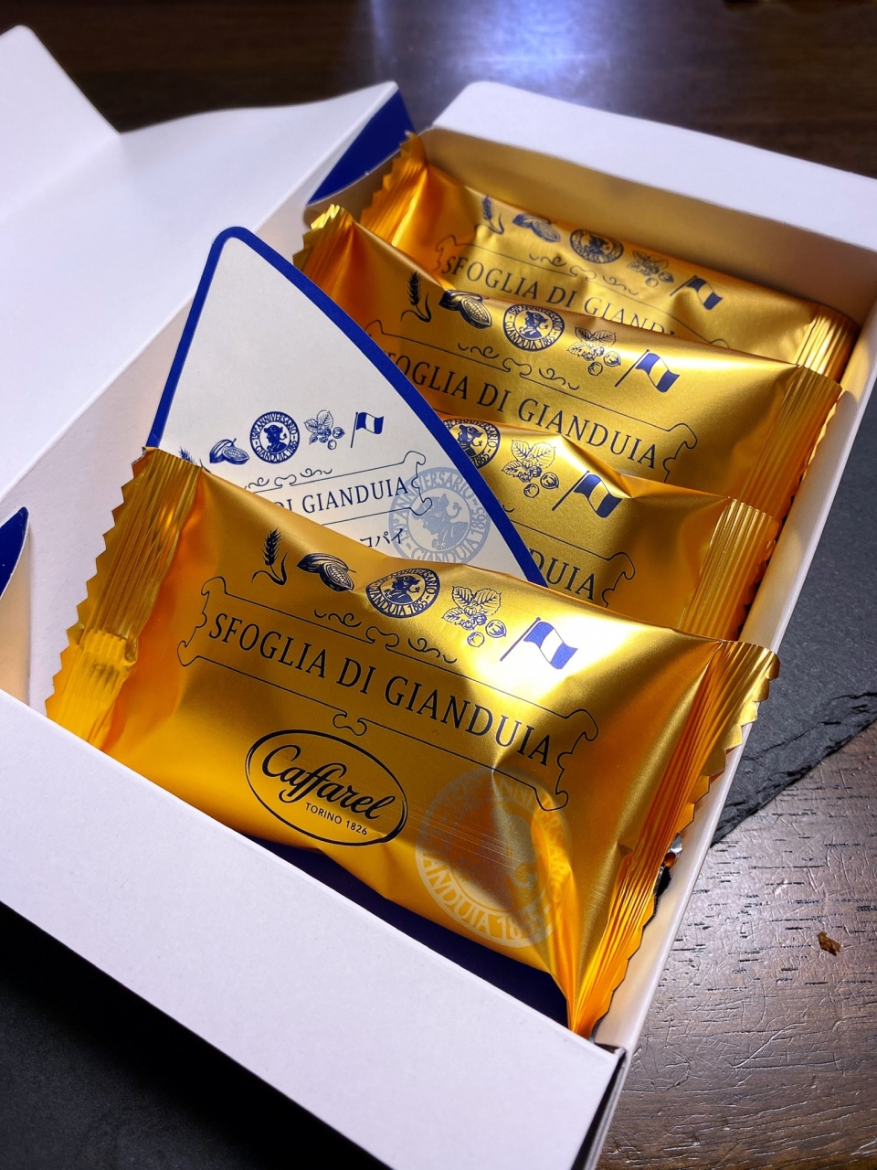 イタリアトリノのチョコレート専門店。カファレルの代名詞とも言えるジャンドゥーヤチョコレートと人気のチョコパイを購入しました。