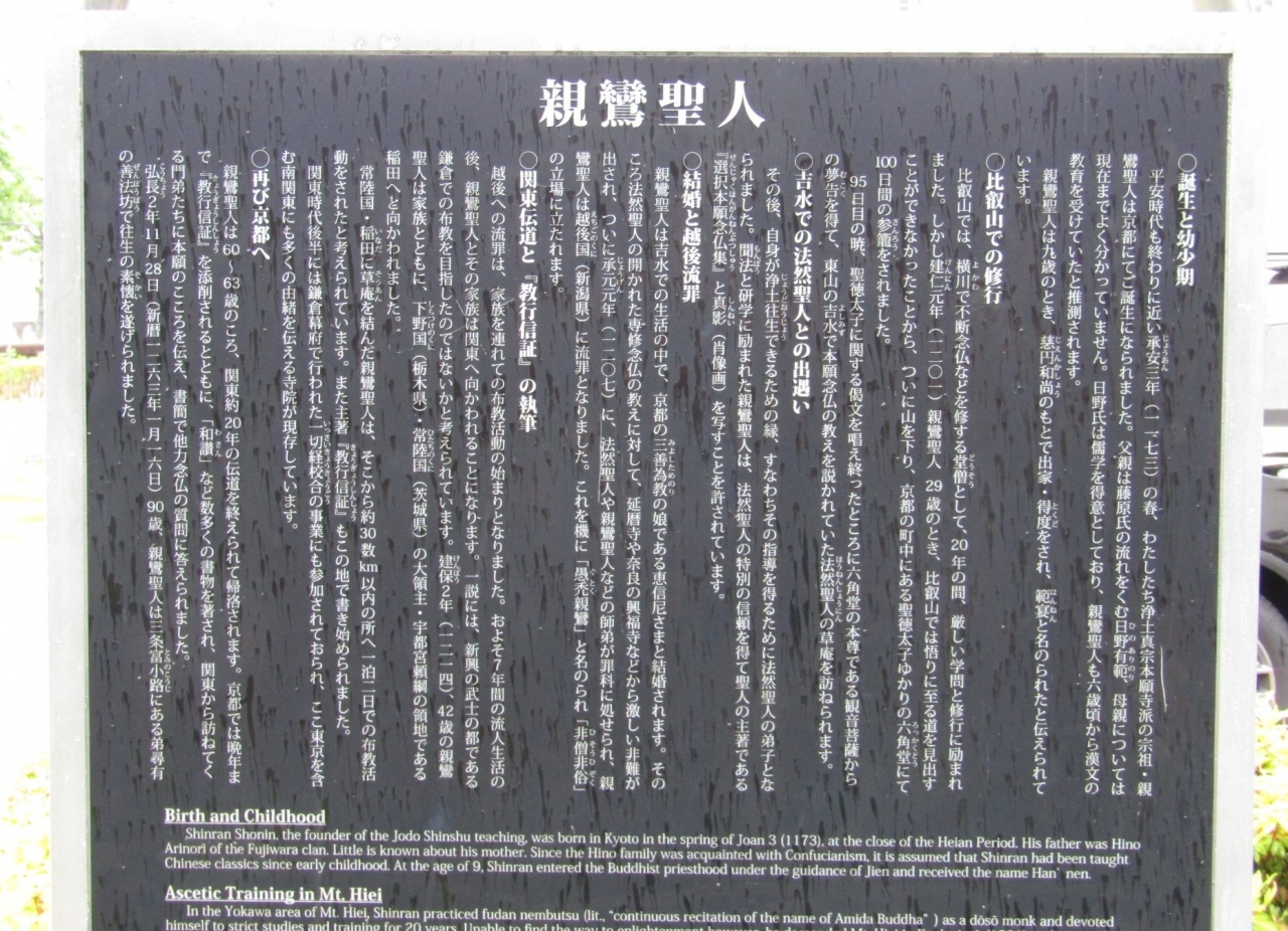 聖人像の脇に親鸞聖人の生涯についての説明板があり、9歳から比叡山で仏教の修行されていたことなど詳細に記載されていて、理解が深まりました。