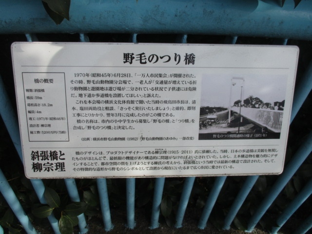 野毛動物園と野毛山配水池をつなぐ歩道橋で利用しやすく便利でした。1971年市民の要望を受け主塔とケーブルで橋桁を支える斜張橋構造です。大きな橋ではないですがベイブリッジに似たデザインでセンスの良さが感じられました。デザイナー柳宗理氏の作だそうです。スマートなデザインを綺麗に維持されてました。
