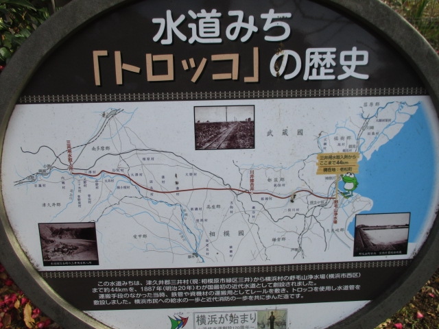 野毛動物園から野毛山公園展望台方面に向かう途中にありました。日本初近代水道の野毛山浄水場の跡地に設けられた配水池で現在はフェンスで囲われ立ち入ることはできませんがフェンス越しから垣間見ることはできました。配水池の説明板はありませんが明治20年(1887年)津久井郡三井村から野毛山浄水場まで約44㎞にわたって創設された日本最初の近代水道(水道みち)の説明板がありました。昭和5年より平成7年まで操業していたそうです。