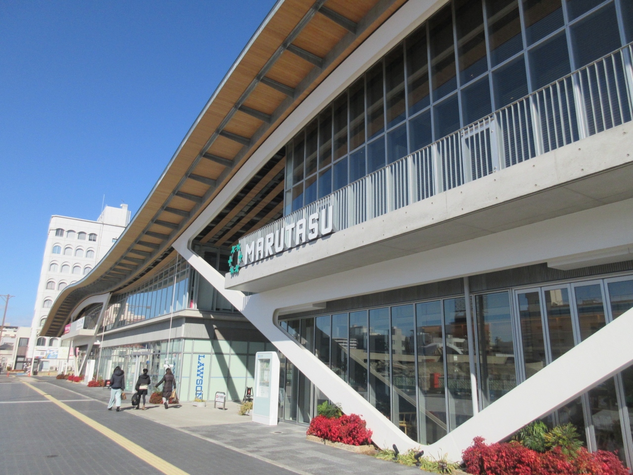丸亀城の見学を終えて北にほを進めますと、丸亀市民広場の東側を過ぎた右手に、図書館をメインにして幾つかの店舗が同居した、近代的なデザインの複合施設がありました。ローソンがありましあので、お城見学のために坂道を歩いた後、のどの渇きを癒すのに絶好のロケーションでした。