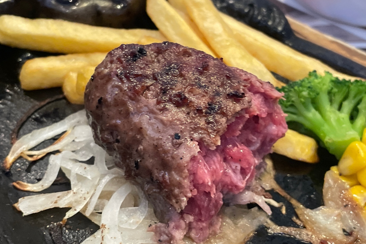 ハンバーグは中はほぼ生で提供されるので、固形燃料のプレートでお好みの焼き加減まで再加熱する必要があります。