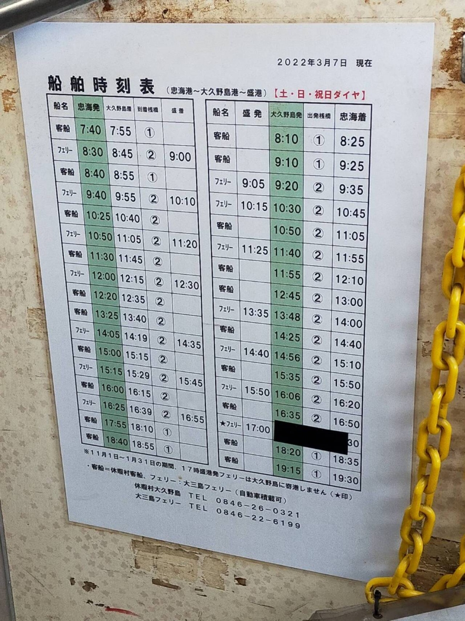 うさぎの島の大久野島へ行くのにこちらのフェリーに乗りました。私が乗船したときは、特に