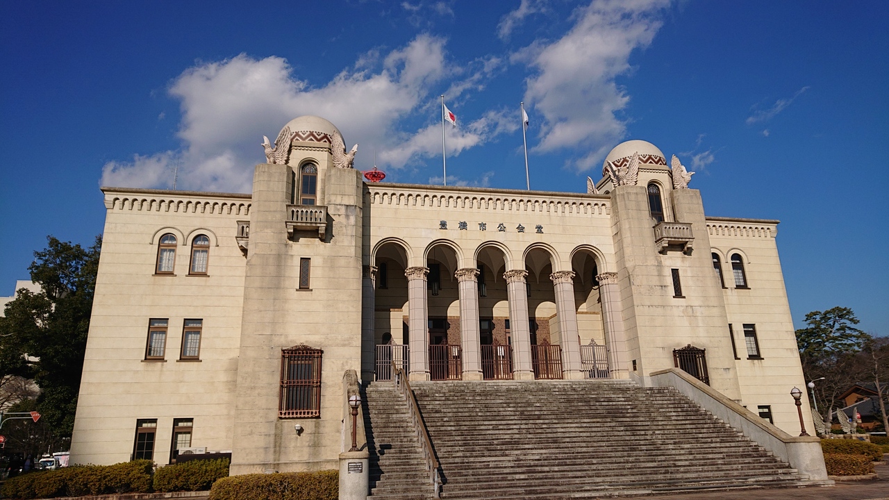 豊橋市役所近くに立地する、公会堂です。戦前から残る建築物という、文化財的な価値を有しているのみならず、現在も現役で利用されているのが、凄いな、と感じます。1月中旬の平日午後の時間帯に訪問しました。白い外観が素敵だな、と感じました。