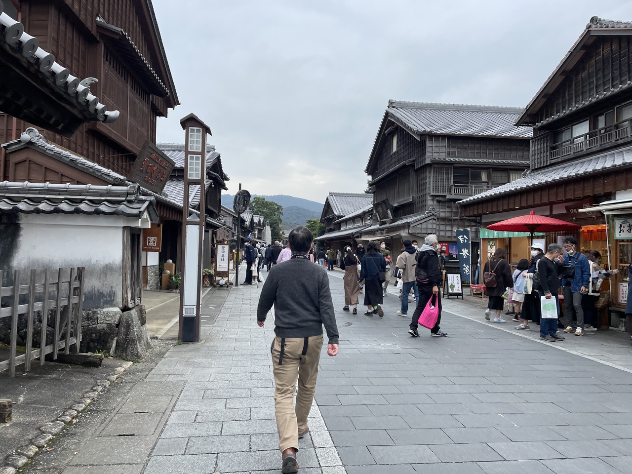 伊勢神宮内宮前の門前町の一角で江戸末期から明治初期の建物を移築、再現したスポットです。駐車場からはこちらを通って行くことになります。沢山のお店が並んでいてとても活気があります。土曜日の昼時だったので大変混雑していて、何を買うのも並ばなくてはいけませんでした。