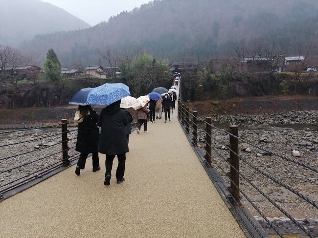 せせらぎ公園の駐車場前、全長107mの吊り橋のであい橋を渡り白川郷に入ります。