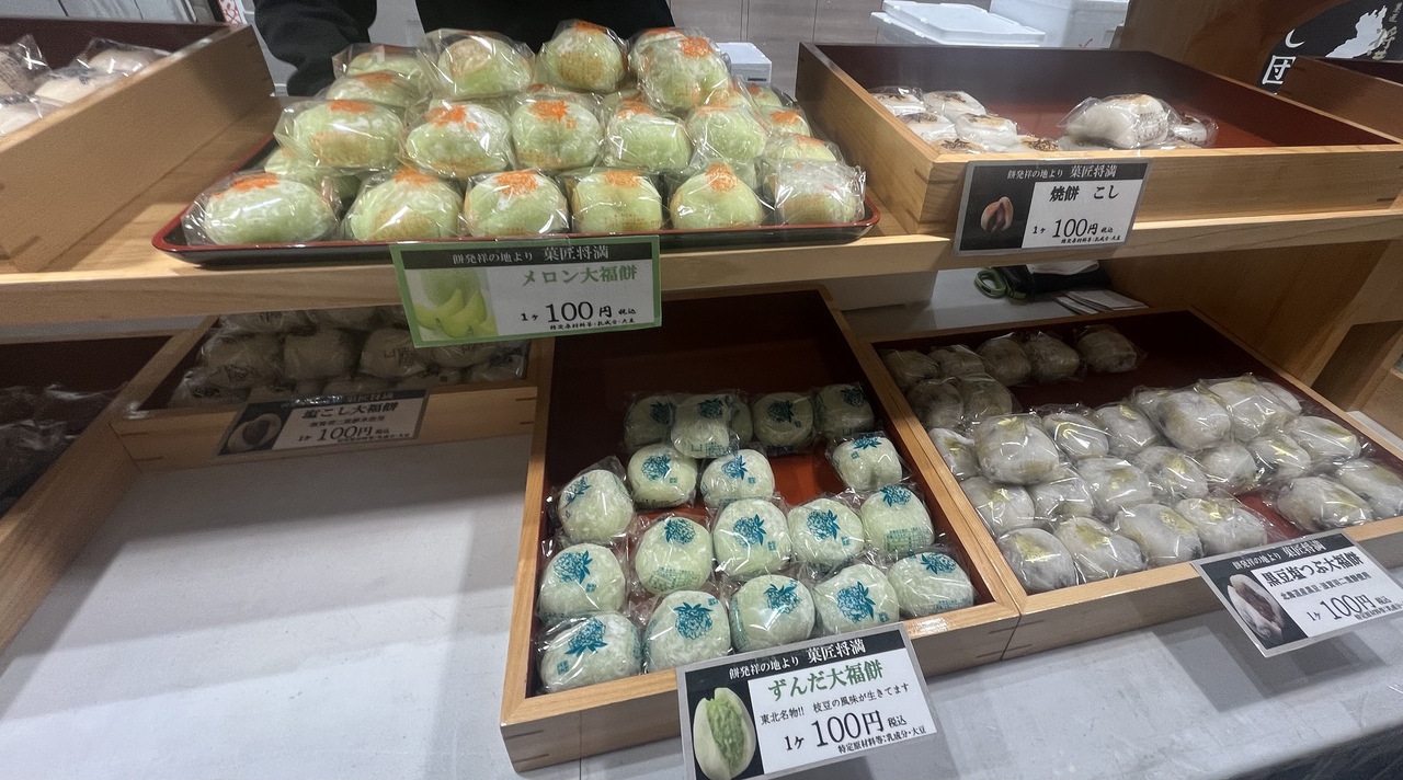 POP UP ストア があり、いろいろな種類の大福が並んでいて、