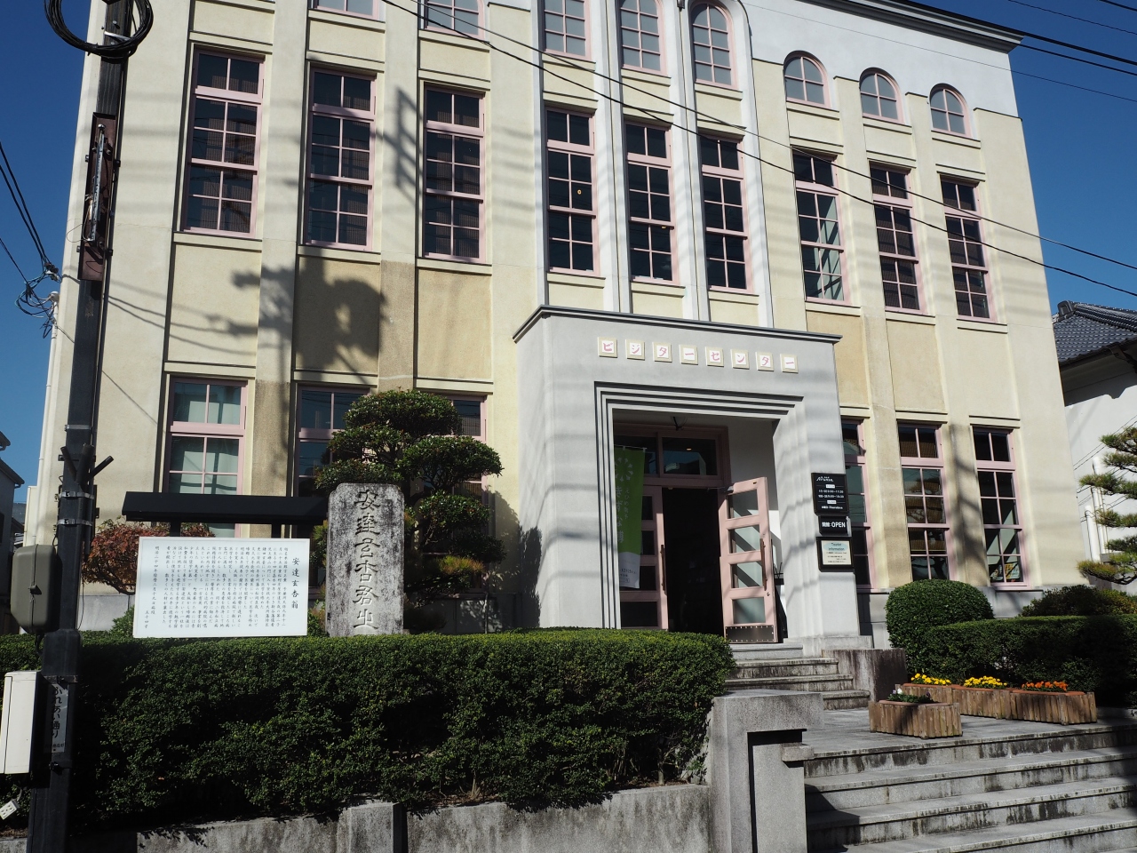 内子駅から歩いて10分ほど、八日市街並み保存地区へと歩いて行く途中に内子町ビジターセンターはあります。ビジターセンターは昭和レトロな感じの3階建てのコンクリートの建物で、かつては警察署として使われていた建物です。なかは観光案内所などになっていて、観光地図やパンフレットが手に入ります。またトイレや休憩スペースもあるので、歩き疲れて寄るにはいいです。