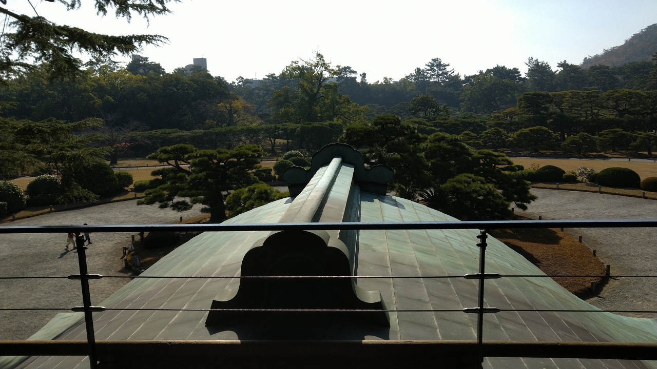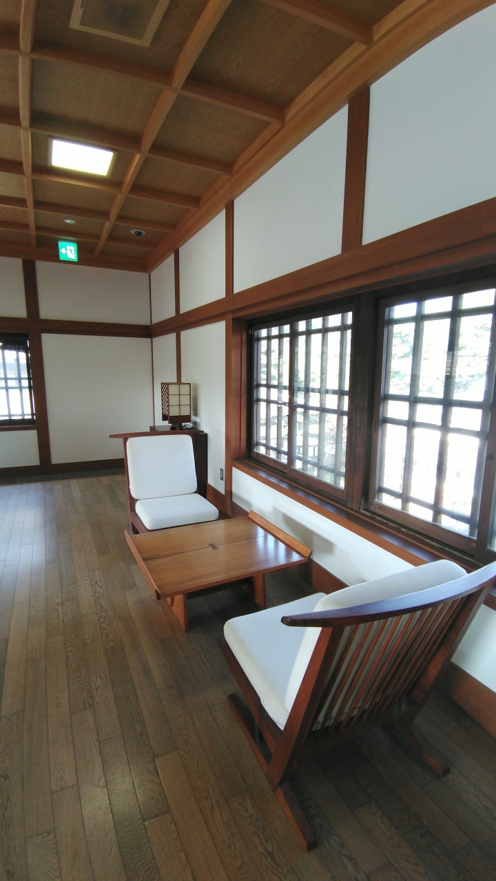 2階に穴場の休憩所があります。ジョージ・ナカジマさんの家具の展示兼、ナカジマさんの椅子に座って栗林公園を静かに一望できるという穴場スポット!