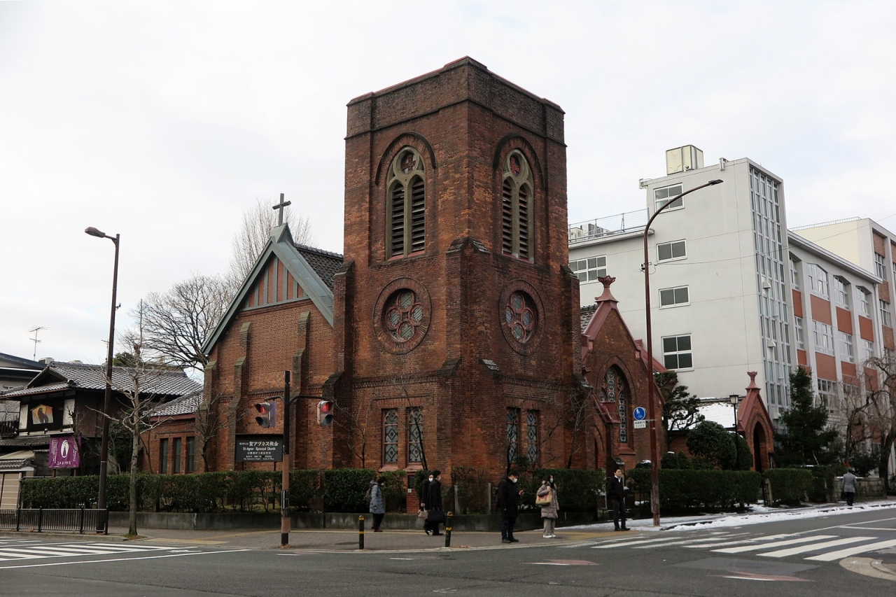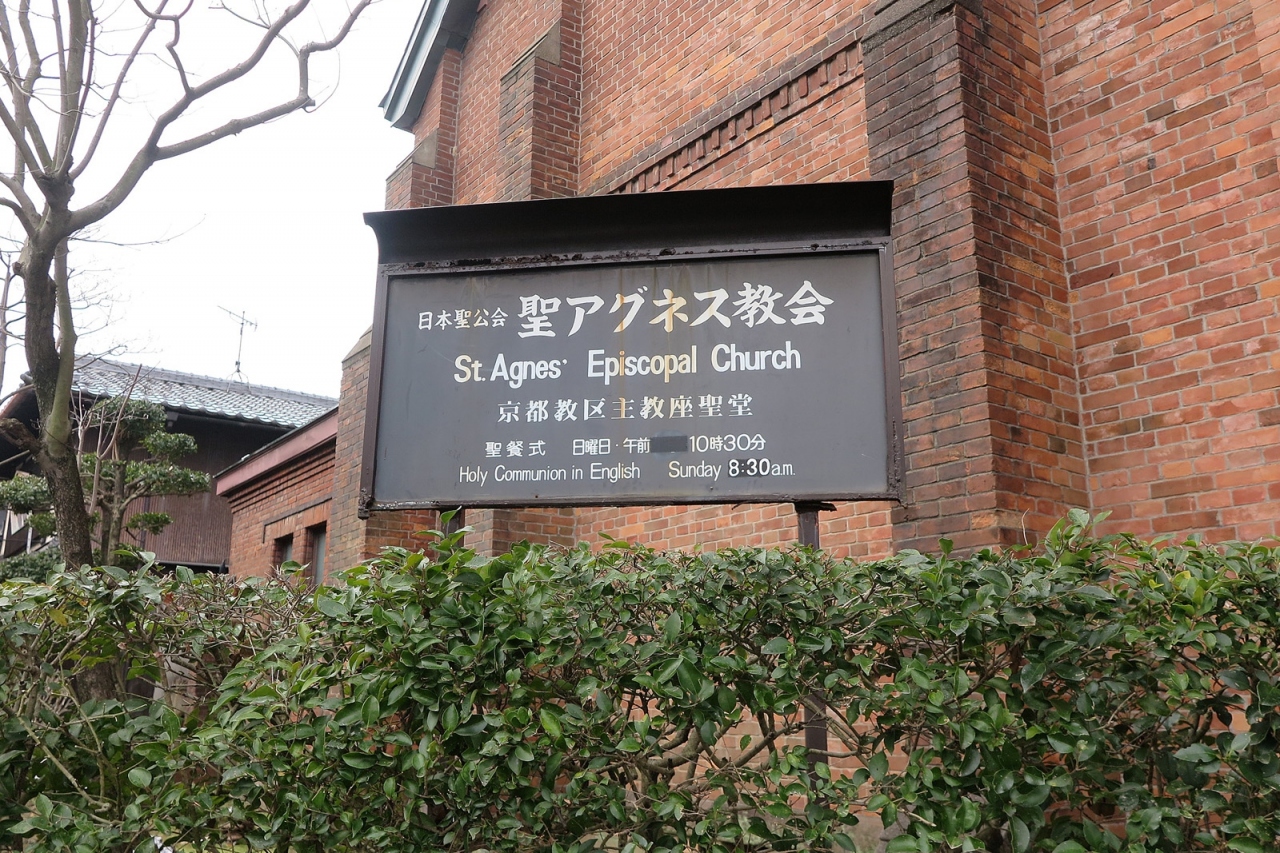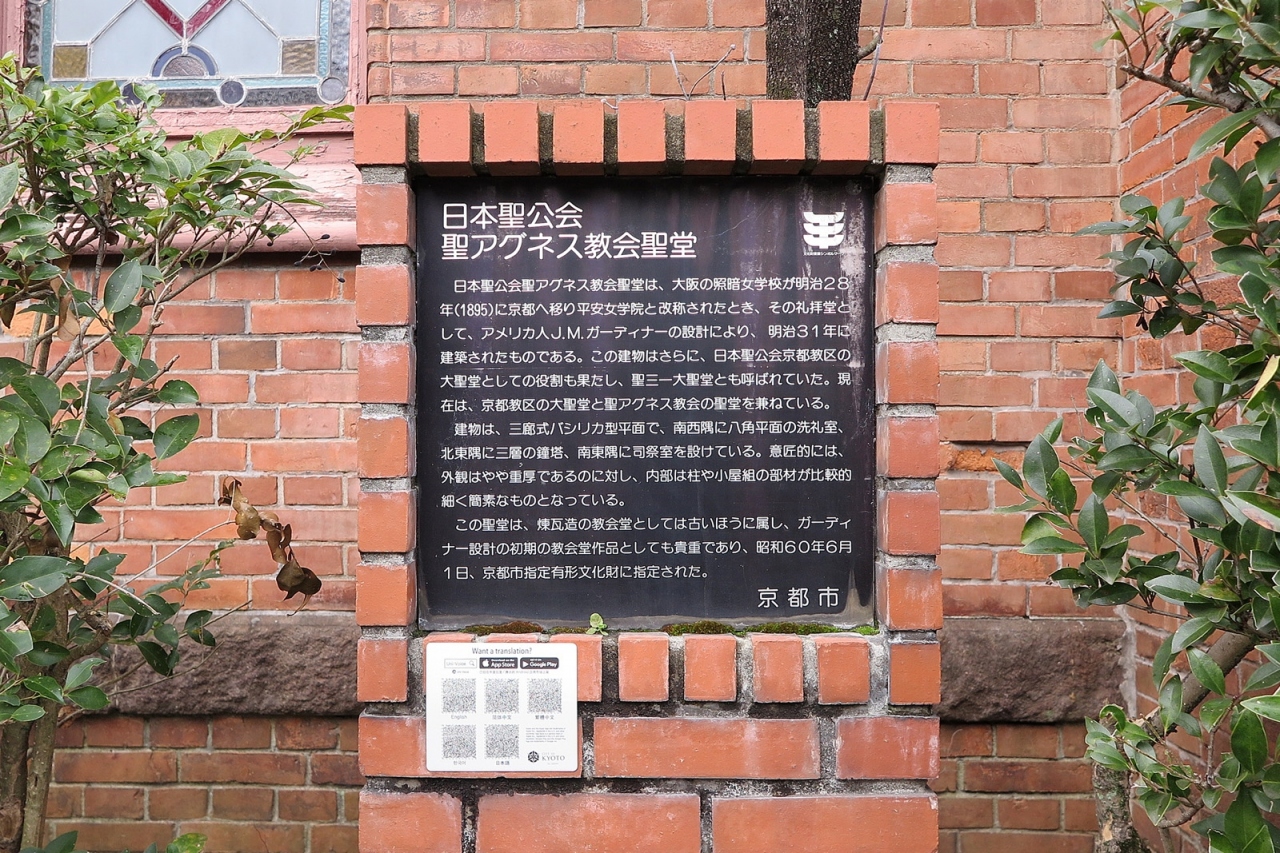 「丸太町」駅近く、目の前には「京都御苑」と「有栖川宮邸」といった雰囲気の場所に突如現れる西洋建築。煉瓦の屈強そうな外観、アーチのデザイン、大きなガラス窓といえばイングランドのチューダー様式…世界史の授業で勉強しました。東京でチューダー様式の代表的建物といえば国教会によって設立された立教大学本館ですが、ちょっと調べたところ、こちらのアグネス教会の設計者は、立教学院初代校長も務めたガーディナーさんと分かりましたし、さらにアグネス教会の日本聖公会とは日本における国教会とのことで、話がつながりました。歴史は面白いですね。
