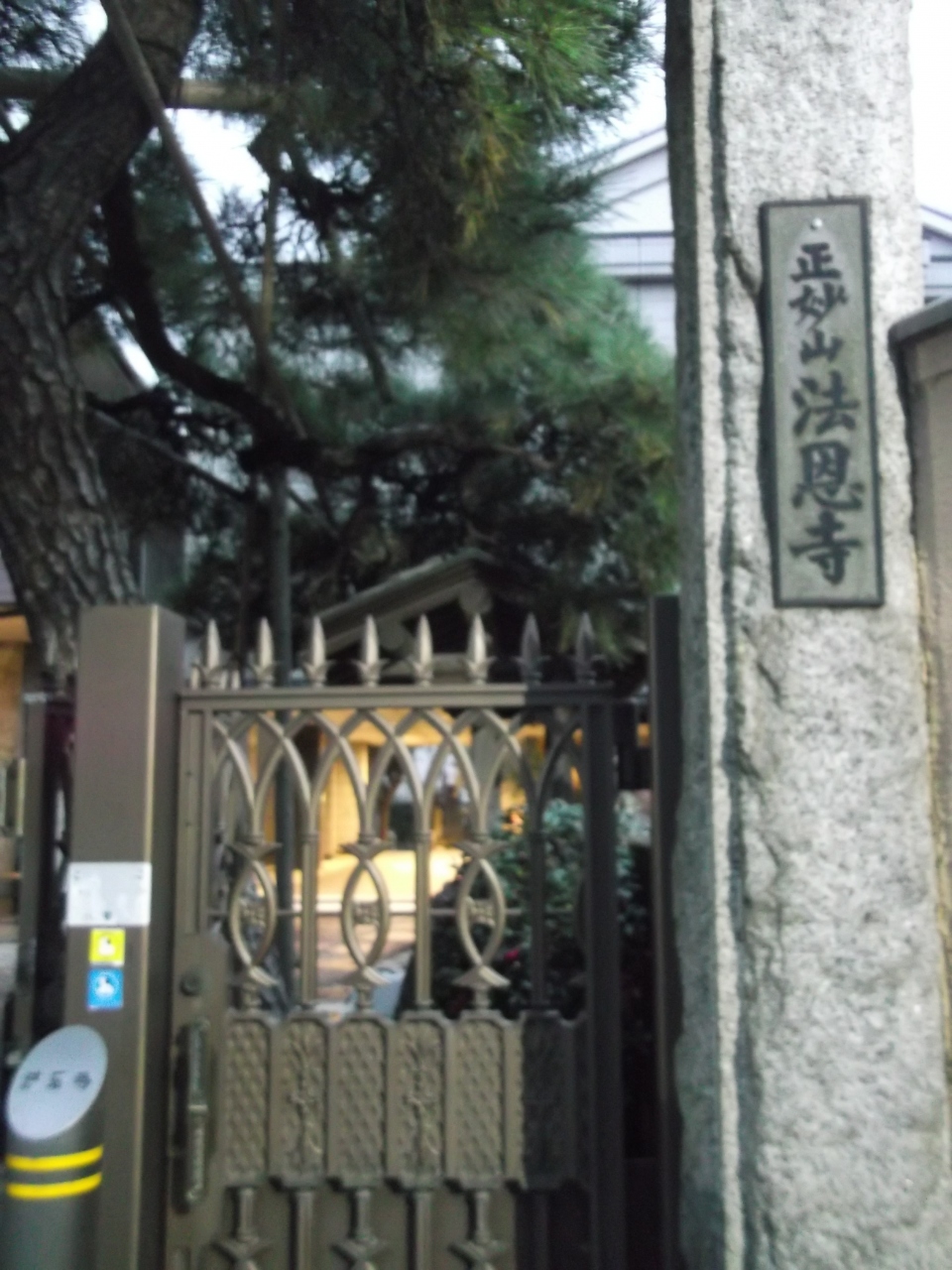 丸ノ内線四谷三丁目駅から歩いて8分ほどのところにある、法華宗の寺院です。 山門のすぐ先に大きな松の木があり、その奥に近代的な造りの本堂がありました。敷地は奥行きがかなり深く、その先には広い墓地があるようでした。