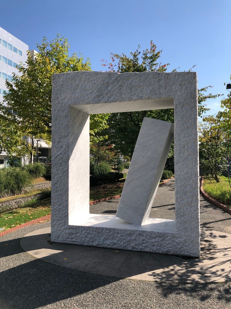四角い枠のなかに四角柱が倒れたようなモニュメントで、創成川沿いにあります。