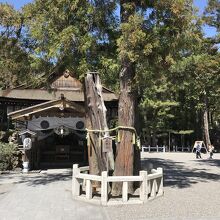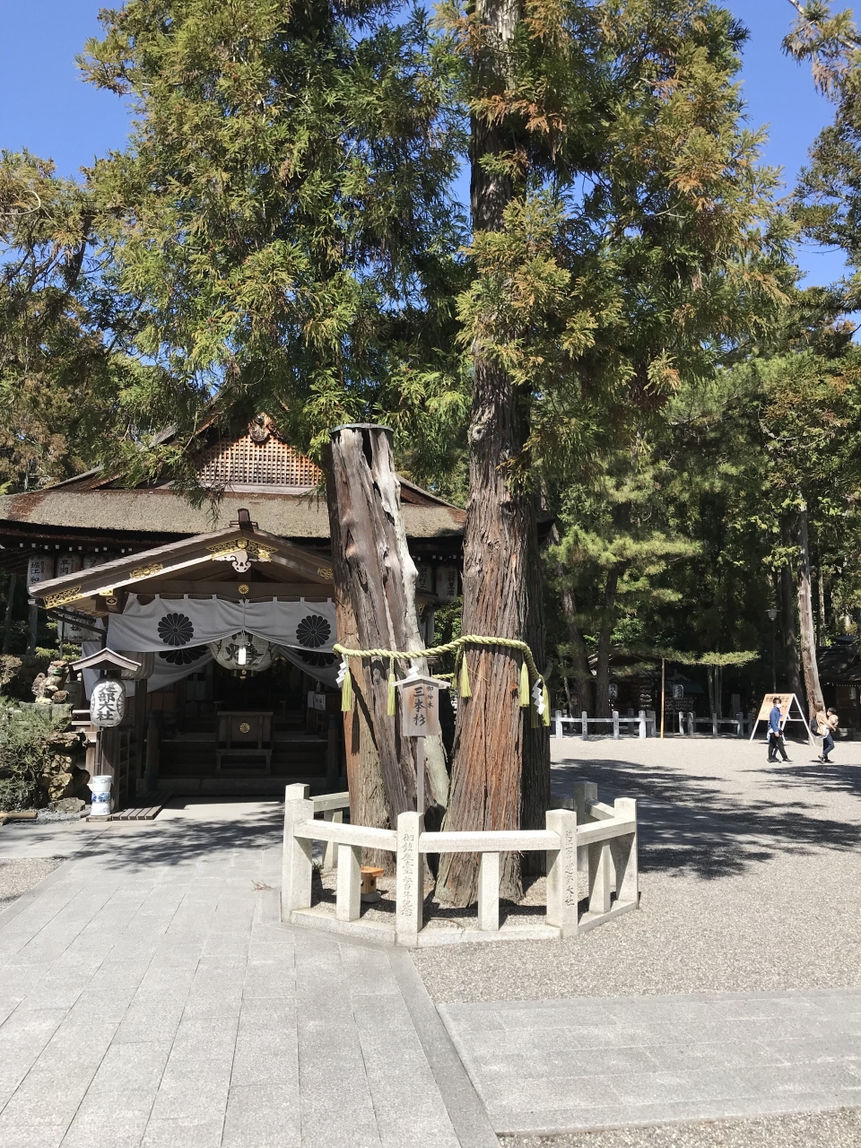 建部大社が創建されたのは、御祭神 日本武尊の父 景行天皇の時代と伝わっています。天武天皇の時代に近江国府があった瀬田に、近江の守護神として移っています。源頼朝は建部大社に参篭して、必勝を祈願したことが平治物語に記されています。拝殿の前には、三本杉と呼ばれる御神木があります。一夜にして成長したと伝わっています。樹齢は1300年近くになりますが、まだまだ元気そうです。