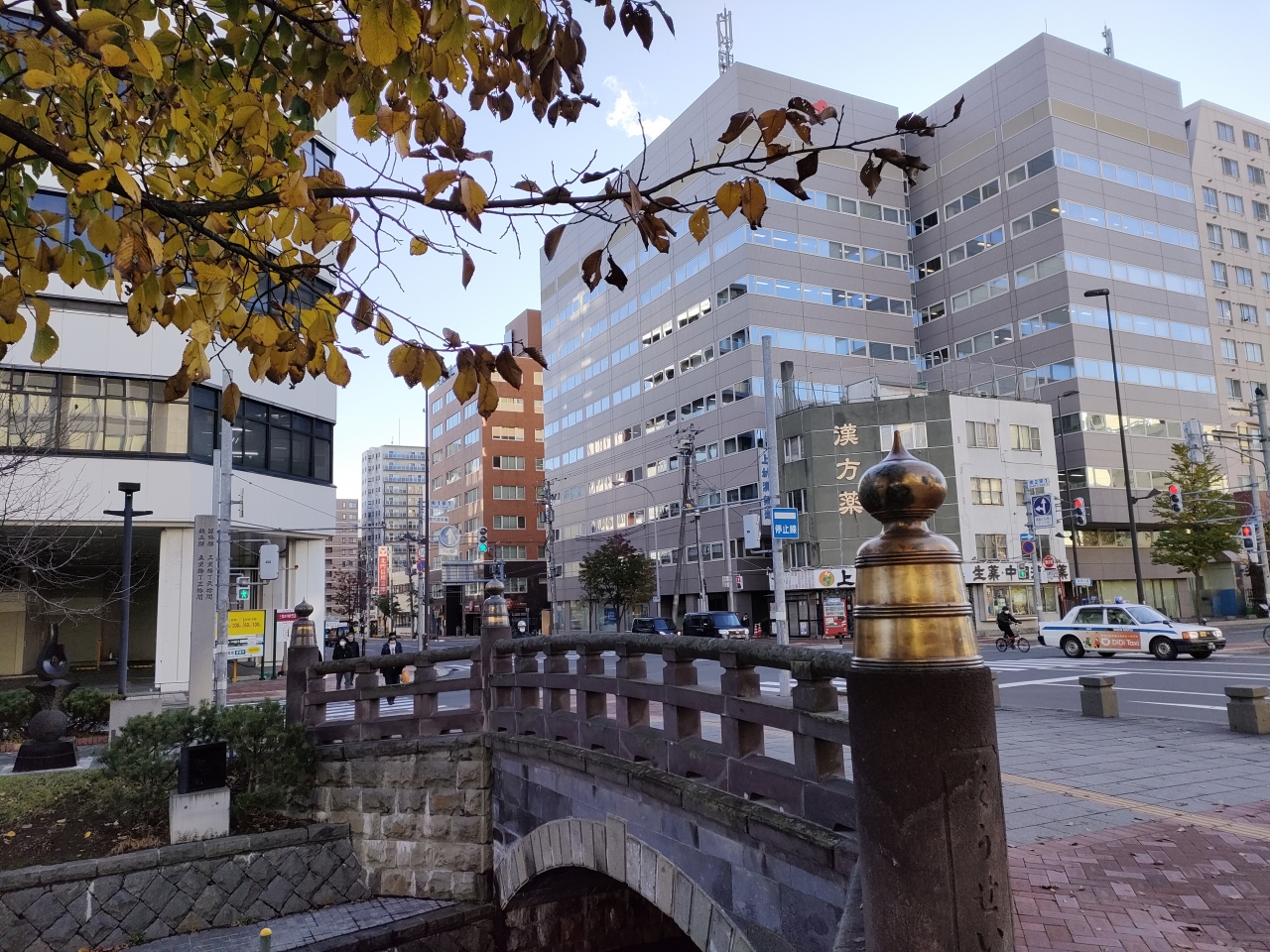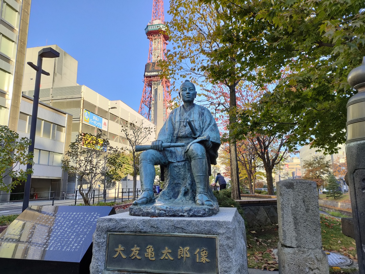 テレビ塔の裏側には、創成川と名の付いた都市小河川が流れていますが、テレビ塔から100mちょっと南側(二条市場、狸小路方面)にかかる創成橋の袂にその像はあります。
