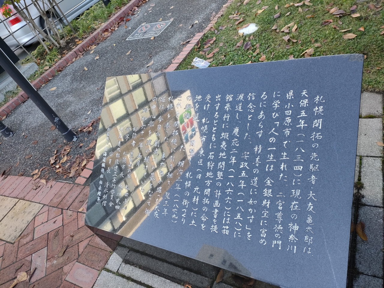 なお、札幌開拓にあたって、大友亀太郎が本拠としたのは、ここから直線で3km弱離れた現札幌市東区の辺りで、大友亀太郎ゆかりの本龍寺や札幌村郷土記念館があり、記念館には彼にまつわる資料などが展示されているので、ここを訪れて興味を持たれたら、ぜひ訪れてみるとよいと思います。