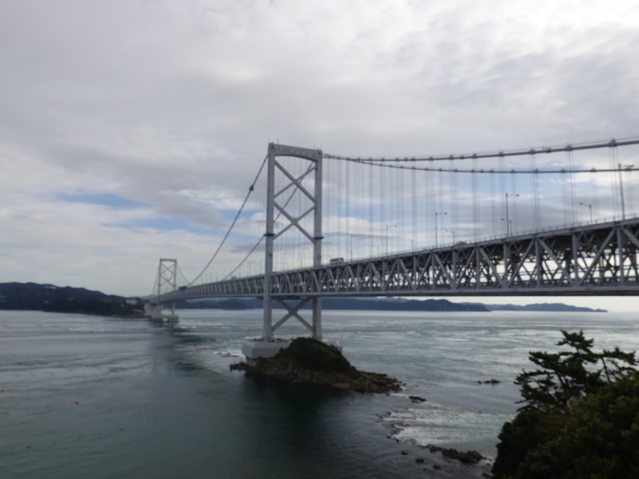 「千畳敷展望台」は、鳴門公園内にある展望スポットの一つで、鳴門大橋を間近に望む迫力ある光景が魅力です。鳴門大橋のたもとに近く、飲食店や土産店などが集まる場所のすぐ奥になります。ここからは橋脚近くで波が渦を巻く姿もよく見ることが出来ました。