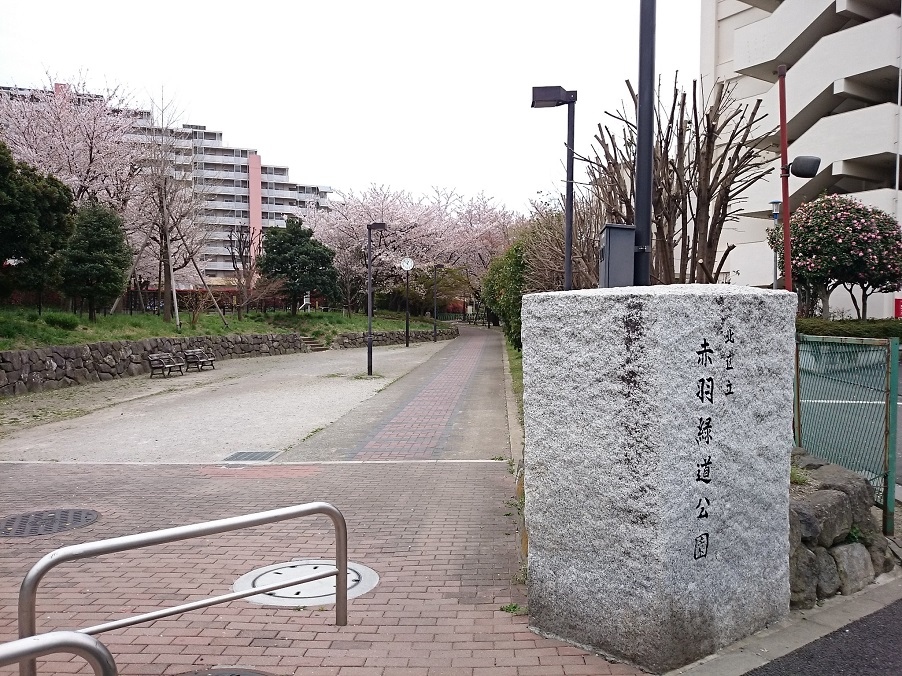 JR赤羽駅から徒歩10分程度、北区赤羽台3丁目にある北区立の公園です。廃線となった軍用貨物の線路跡を利用して整備された細長い公園です。赤羽駅西口近くから赤羽自然観察公園まで約1km続き、立ち寄った4月上旬には桜が満開で、せっかくだったので細長い公園の散策路を散策してみました。素敵な緑道だと思います。