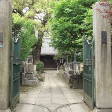 根津駅から善光寺坂を歩いて9分ほど、谷中6丁目の交差点を霊園の方に向かい少し奥に入ったところにある日蓮宗の寺院です。参道を本堂に向かって進んでいくと、すぐ手前に大きなクスの木が立っていました。そのすぐ横には、幕末の三舟と称された中の一人である高橋泥舟の墓もありました。