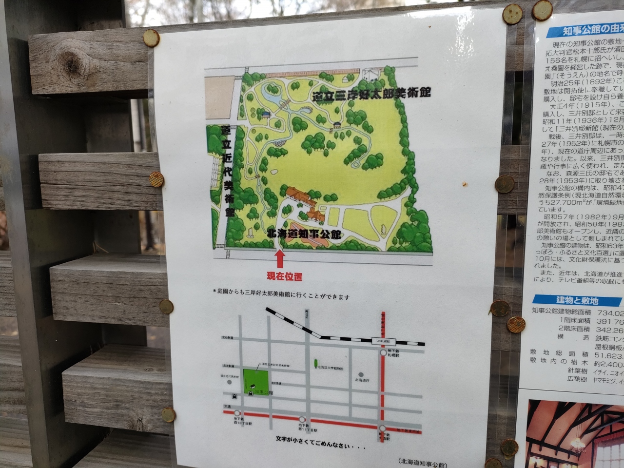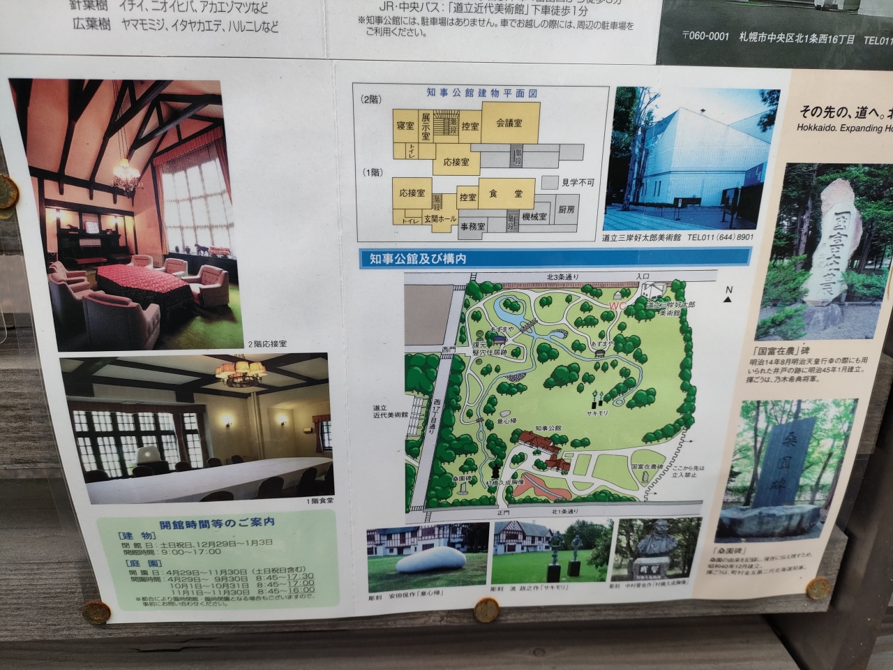 札幌駅から南西方向に直線で1.7kmほどの場所にあり、おしゃれな洋館と広い芝生と木の庭が楽しめるが、中島公園の豊平館や北大植物園ほど楽しめるものでもないので、知事公館に隣接する道立近代美術館を訪れた際に、向かいの大きなスイーツのお店、北菓楼に寄りながら訪れるとよいかもしれない。