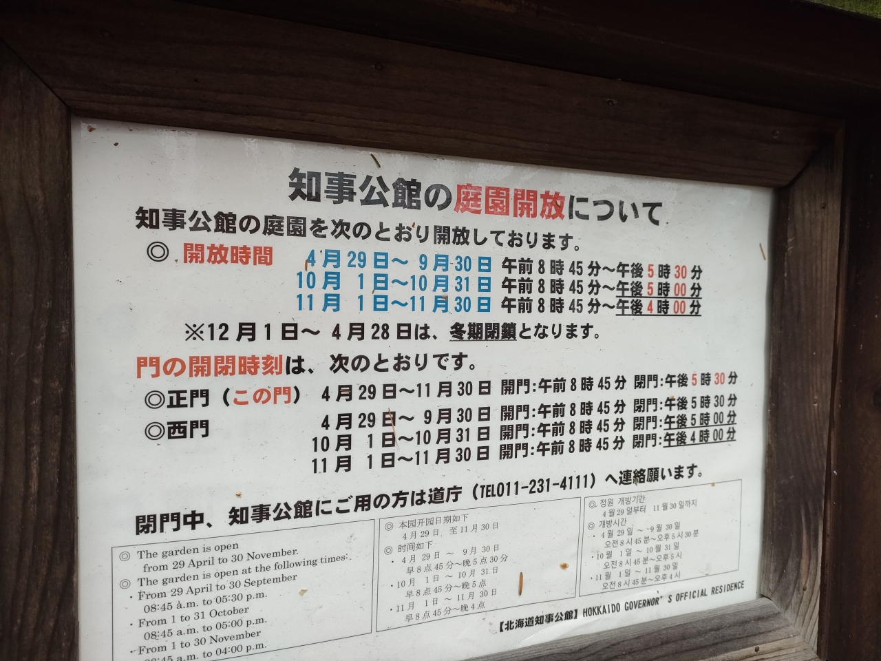 知事公館は、官庁の建物らしく、土日祝、それに官庁御用納めの年末年始はお休みである。また、庭の方は無雪期の毎年4月末から11月いっぱい開放されている。庭の芝生は犬を遊ばせるのには覿面な広くて開放的な庭だが、立て看板の通り、犬の解放は厳禁となっている。そこで犬のフンの心配なく走り回れるので、子供たちが走り回るのによいと思う。ただ、大通公園のように遊具類は無い。周囲はビルやマンションが建っているというのに、ここは広い草原と洋館が建つお庭で、中島公園や大通公園などとともに都会のオアシス的な場所である。