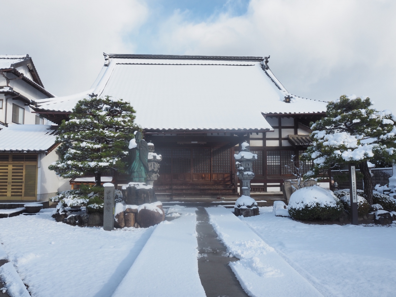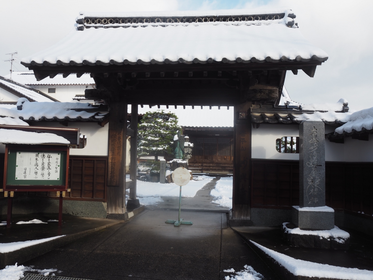 妙興寺は米子の寺町にあるお寺で、江戸時代から続く寺町にある9つの寺院のひとつです。妙興寺は日蓮宗のお寺です。山門は四柱門で門に続いて塀があります。山門をくぐり10メートル歩くと本堂です。本堂の手前には日蓮上人の像がありました。前日からの寒波で雪が降り積もっていましたが、こちらは山門の下や本堂へと続く道に雪除けがされていました。気持ちよく参拝をさせていただきました。
