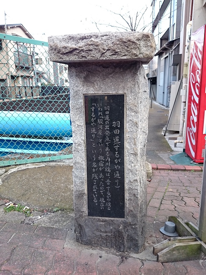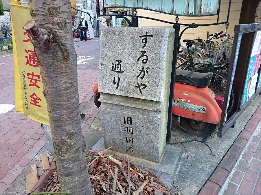 京浜急行大森町駅から徒歩5分程度、大田区大森東2丁目の内川橋から大森南、東糀谷を通って羽田方面へ至る約5kmの道です。大森散策の途中でこの通りを歩いてみました。内川橋のたもとに駿河屋という旅宿が有った為に、するがや通りと呼ばれていたそうです。通りの途中に【するがや通り】の道標が立っています。舗装はされているものの、ところどころにかつての羽田道の面影が残っているような気がしました。