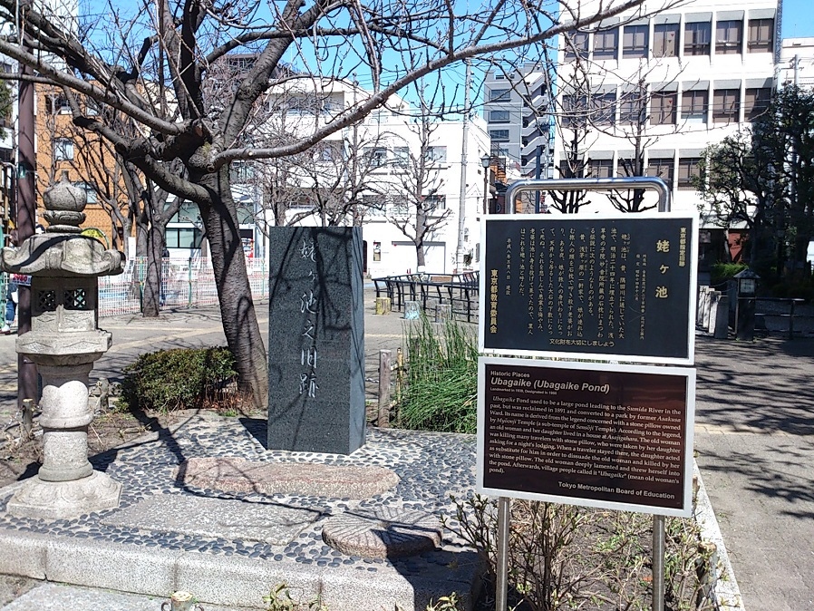東京メトロ銀座線浅草駅から徒歩5分程度、台東区花川戸2丁目の花川戸公園内に石碑が立っています。かつてこの場所には姥ヶ池という隅田川に通じる大きな池がありましたが、明治24年に埋め立てられてしまったそうです。東京都の旧跡に指定されています。この姥ヶ池の他にも新吉原花園池やひょうたん池など、この辺りにはその昔池がいっぱいあったのですね。