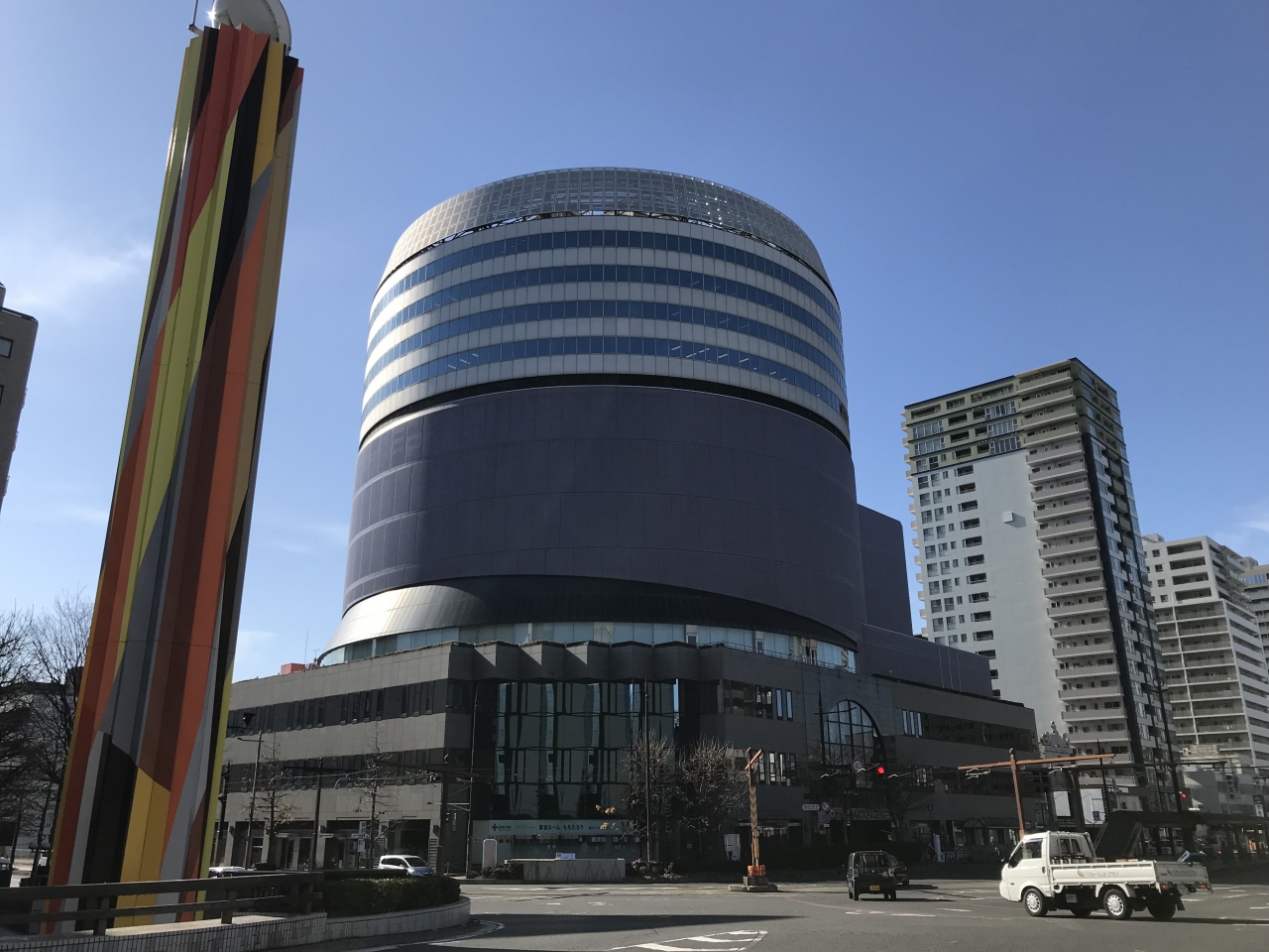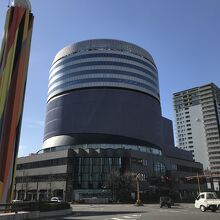 岡山シンフォニーホールは、JR岡山駅から路面電車で城下停留所を降りたすぐの場所にあります。円形のデザインと薄い紫色の外壁がとても印象的です。1階は誰でも入れる場所になっていて、ベンチも多数あるので観光などの休憩にも便利な場所です。ホールのステンドグラスがとてもきれいでした。