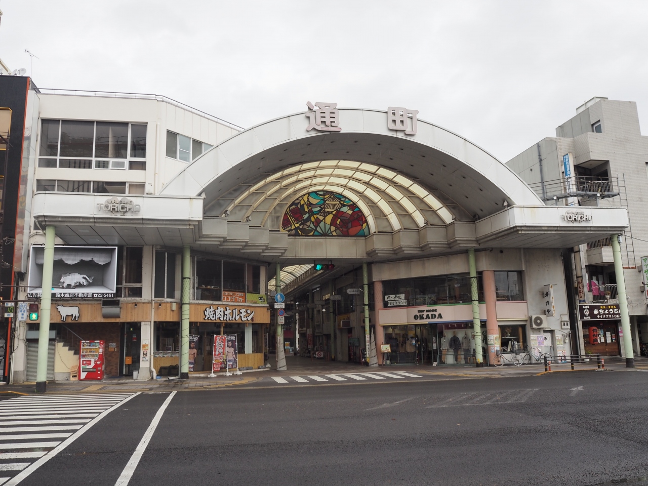 丸亀通町商店街は丸亀市街地を南北に走るアーケードの商店街です。数百メートルほどの長さのアーケード街で、丸亀駅から丸亀城へと行く道として利用しました。普通の道を歩くよりも、このような商店街を歩く方がいろいろなお店が見られたり、変化があって楽しいです。訪れた日は小雨が降ったり止んだりの天気であったので、天井があるアーケードがはありがたかったです。