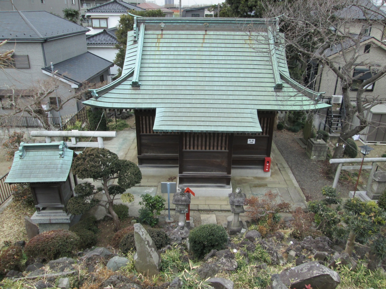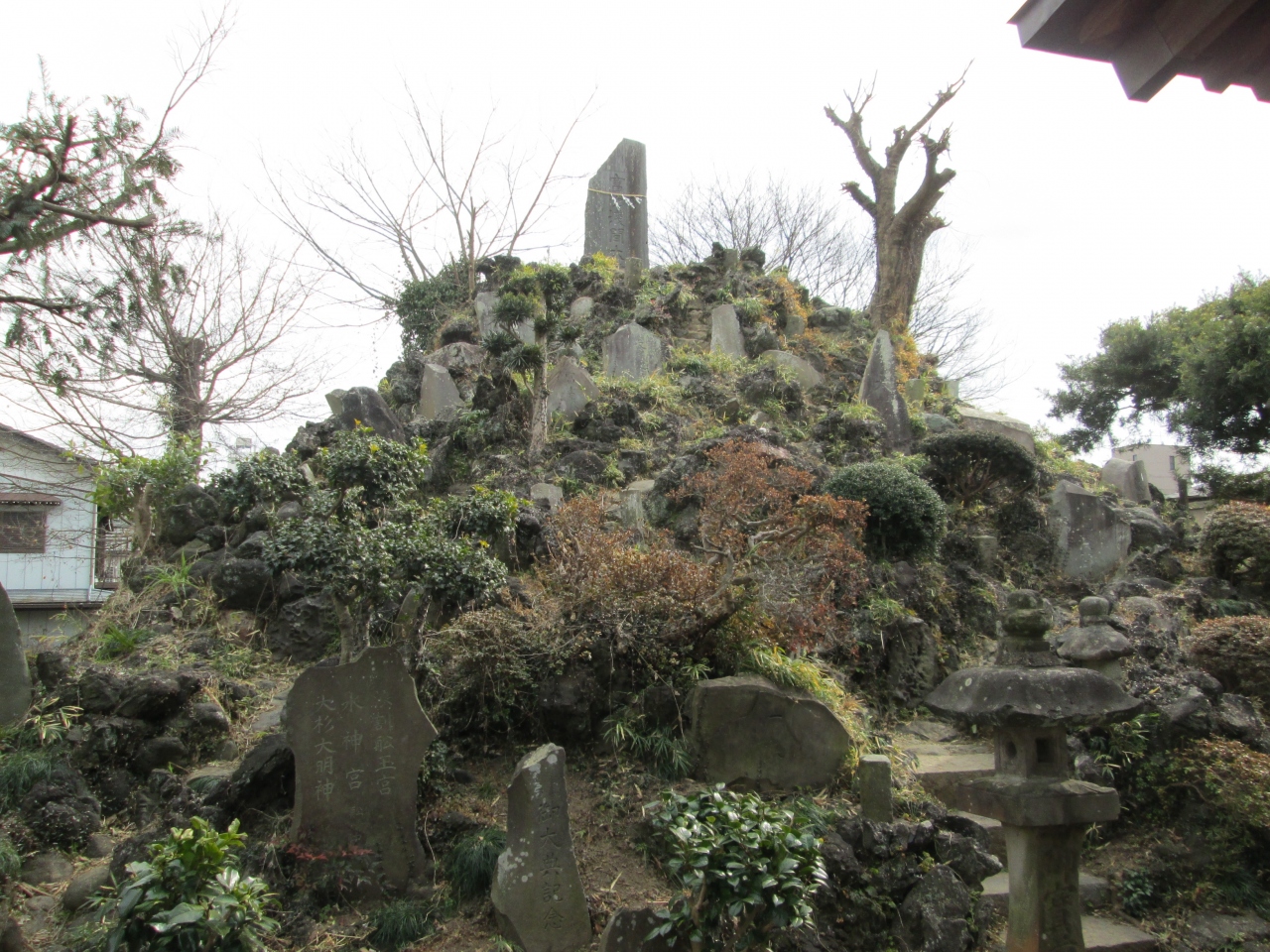 創建は1644年、御祭神は木花開耶姫命です。鳥居の手前に境内社成田不動尊と庚申塚があります。鳥を潜ると、境内社天満宮、神楽殿、正面に拝殿、拝殿両脇に保存樹木カヤとイヌカミが建っています。拝殿の後ろに境内社伏見稲荷と石碑境内社がります。拝殿真後ろに富士塚があり、登ることが出来、山頂には浅間大神の石碑が建っています。登山途中合目標識もあり、登山感覚を味わえます。足場少し不安定なので、上り下りの際手を地面に添えて動くことをお勧めします。本物の富士山は六合目までしか登っていませんが、ミニ富士登山の山頂に建つのは数回以上になります