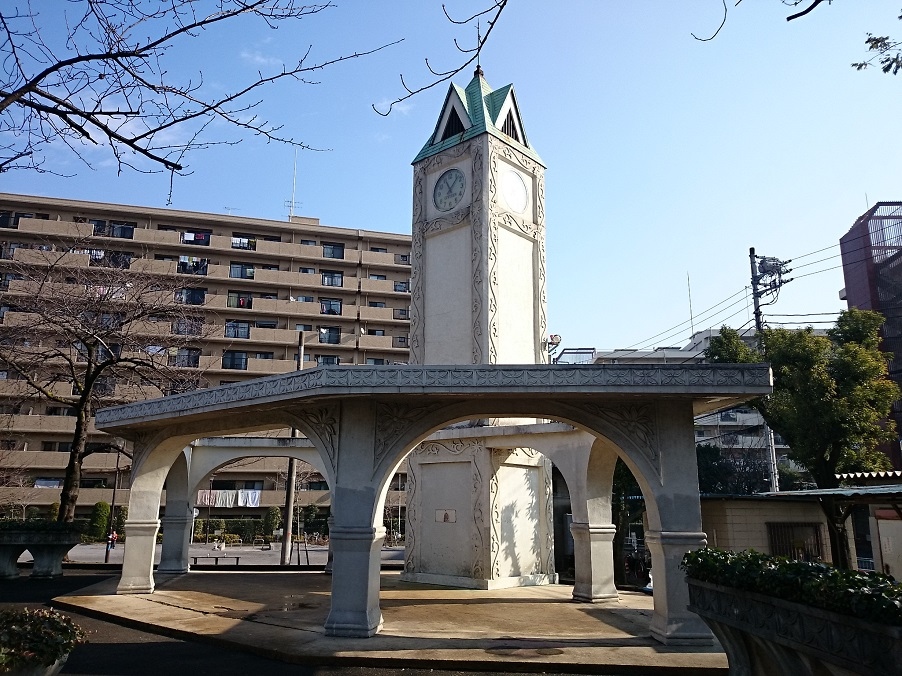 JR赤羽駅から徒歩5分程度、北区赤羽南1丁目にある北区立の公園です。昭和35年(1960年)の開園で、噴水広場があり子供向けの遊具も揃っている公園です。面白い形をしたゲートを良く見ると滑り台になっていました。駅に近い事もあり、立ち寄った時には親子連れで混雑していました。