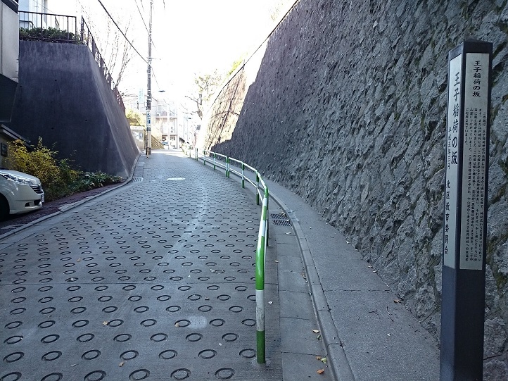 京浜東北線王子駅から徒歩5分程度、北区岸町1丁目の王子稲荷神社の南側の坂道です。長さ100メートルほどの急こう配の坂道で、片側が石垣のせいか、江戸時代の旧街道の坂道の面影が残っているような気がしました。王子稲荷神社参拝の際には王子稲荷の坂も通ってみてはいかがでしょうか!