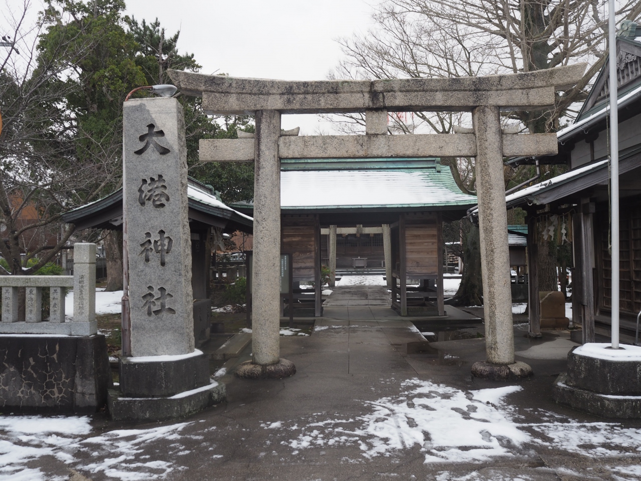 境港の水木しげるロードのなかほどからワンブロックほど境水道へと歩いた場所に大港神社はあります。神社の境内は木々が多く少し薄暗い感じがあり、静けさが強かったです。ここから境水道へ歩くと境港の漁港になります。この神社は漁業の町である境港にふさわしい神社で、出漁したさいの航海安全や大漁などを祈願した神社です。